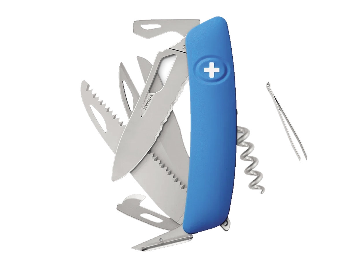 - Lama da 75 mm "Single Hand seghettata" c/sistema di bloccaggio- Alesatore / Punteruolo da cucito c/asola- Levacapsula c/cacciavite piatto No. 3 e  piega fili- Apriscatole c/cacciavite piatto No. 1-  Cavatappi  -  Pinzette-  Seghetto-  Forbici