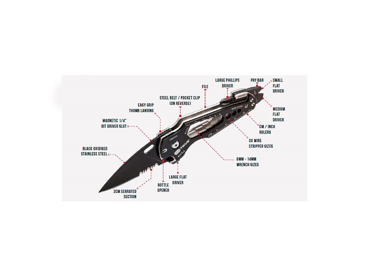 - Coltello tascabile  con bloccaggio lama-  3x Cacciaviti piatti-  Cacciaviti magnetici 1/4"-  Limetta-  Spellafili-  Righello-  Leva-  Chiavi inglesi-  Clip-  Apribottiglia