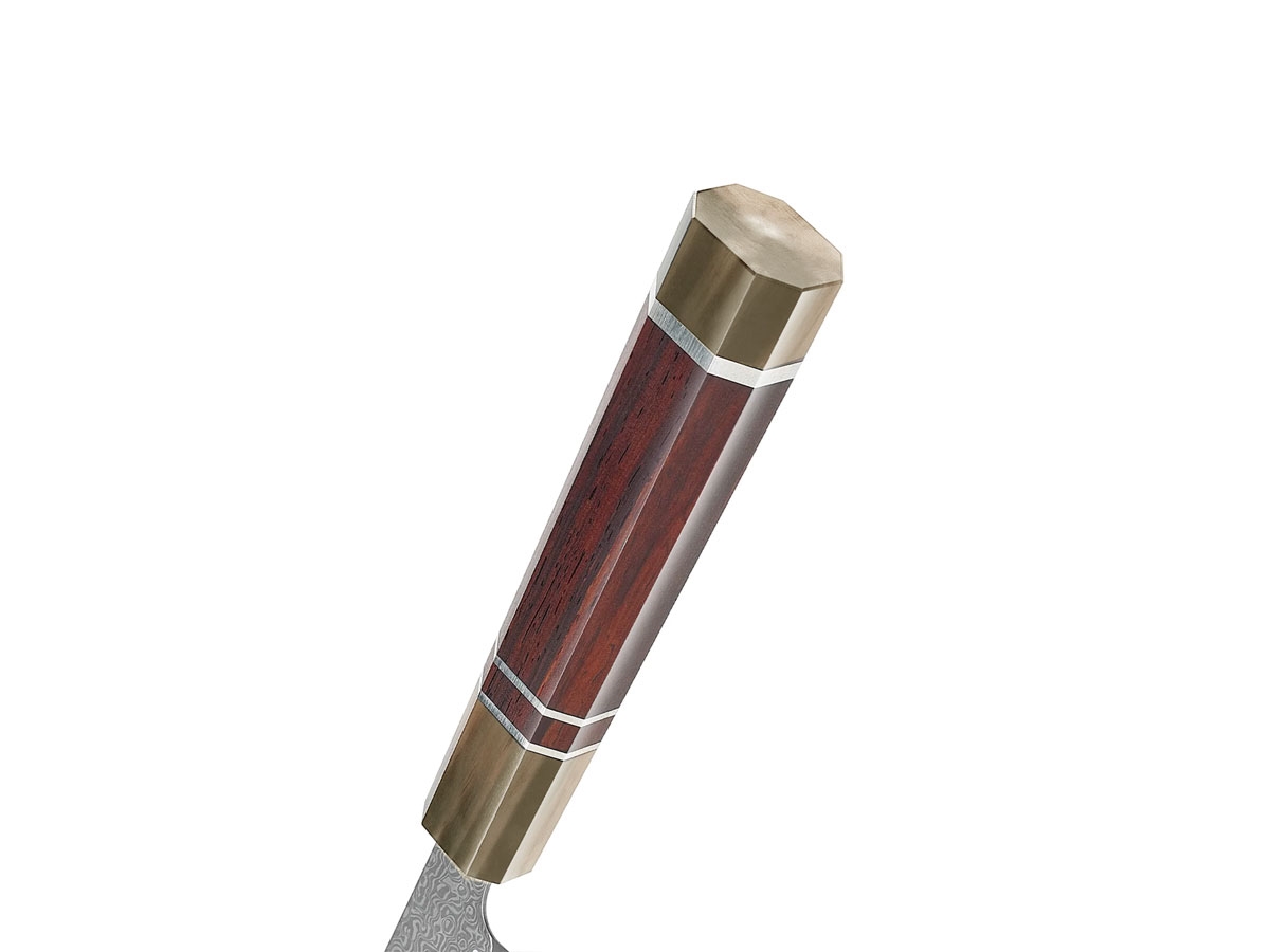 La lama presenta un acciaio damasco VG10 a 67 strati con 61±1 Rockwell e con motivo "a gocce di pioggia" ed ha una rifinitura acidata. L'impugnatura dalla forma smussata e dritta applica legno di palissandro, corno di bufalo e nichel argento.