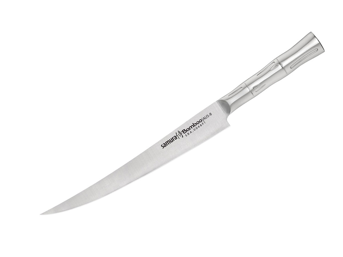 Coltelli da cucina professionali in acciaio speciale AUS-8 a singolo strato, noto per la sua durata e le sue elevate prestazioni. Da un lato la durezza dell'acciaio di 58 HRC consente di mantenere la nitidezza del filo per periodi prolungati e, dall'altro lato non richiede ulteriori sforzi durante l'affilatura. La costruzione interamente in metallo è completamente priva di saldature, rivetti e giunti, rendendo la serie assolutamente igienica e inadatta alla crescita batterica. Inoltre, a differenza della maggior parte dei coltelli, questi sono lavabili in lavastoviglie. Il manico insolito ed elegante è in stainless steel ed ha la forma di un gambo di bambù che assicura una presa salda e fornisce un controllo assoluto sul processo poiché il coltello non scivola né gira nemmeno con la mano bagnata.