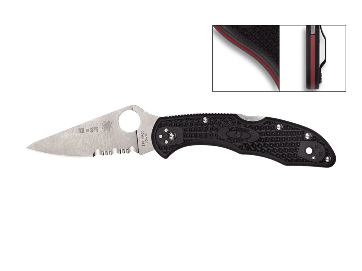 Le guancette nere del manico in nylon rinforzato con fibra di vetro (FRN) e stampate a iniezione sono assemblate con liner in rosso, che crea un'avvincente "linea sottile rossa". A differenza della versione standard di questo modello, la lama in acciaio inossidabile VG-10 ha una molatura completamente piatta ed ha inciso al laser il motto "Save and Serve".