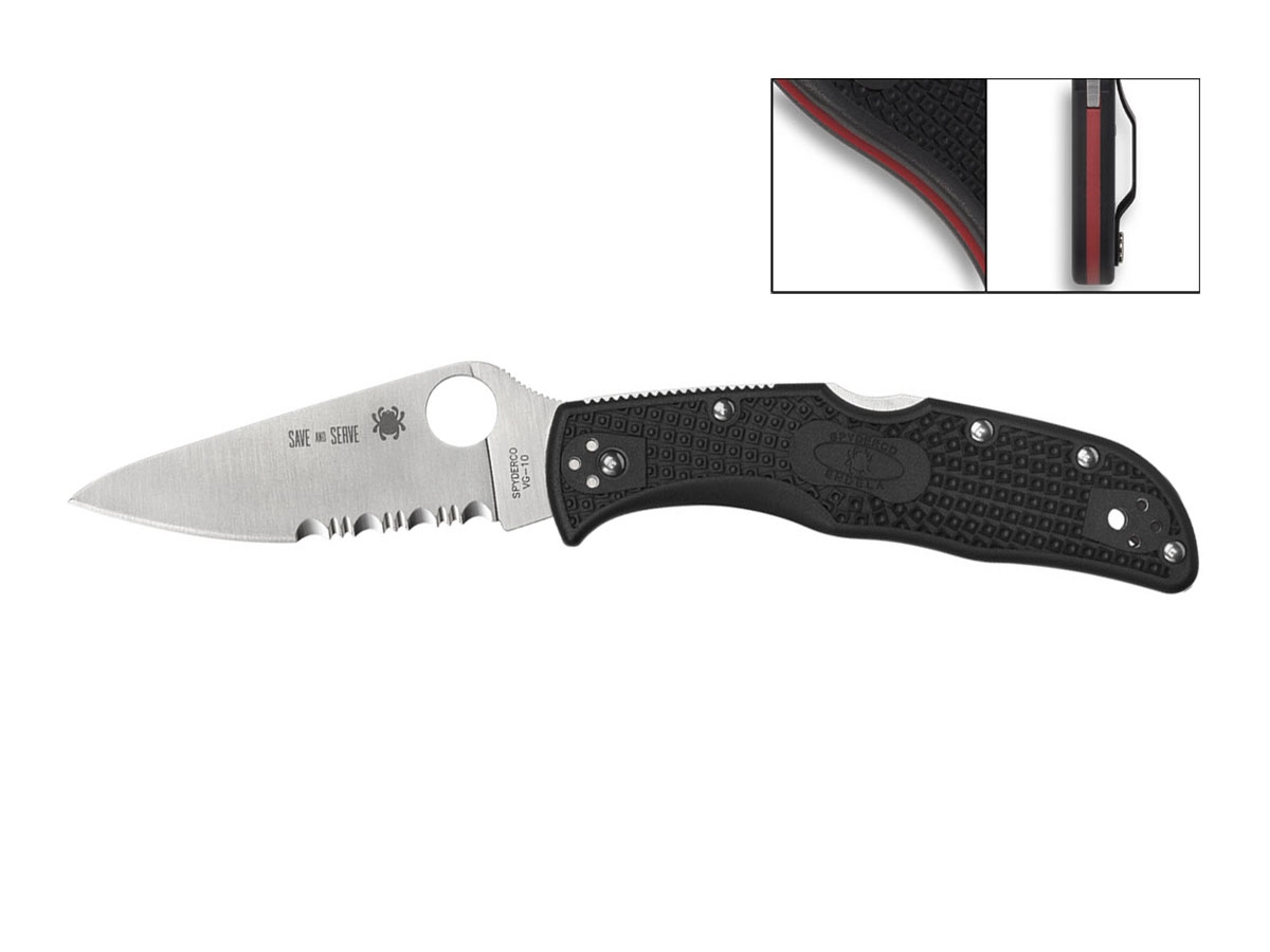 Le guancette nere del manico in nylon rinforzato con fibra di vetro (FRN) e stampate a iniezione sono assemblate con liner in rosso, che crea un'avvincente "linea sottile rossa". A differenza della versione standard di questo modello, la lama in acciaio inossidabile VG-10 ha una molatura completamente piatta ed ha inciso al laser il motto "Save and Serve".