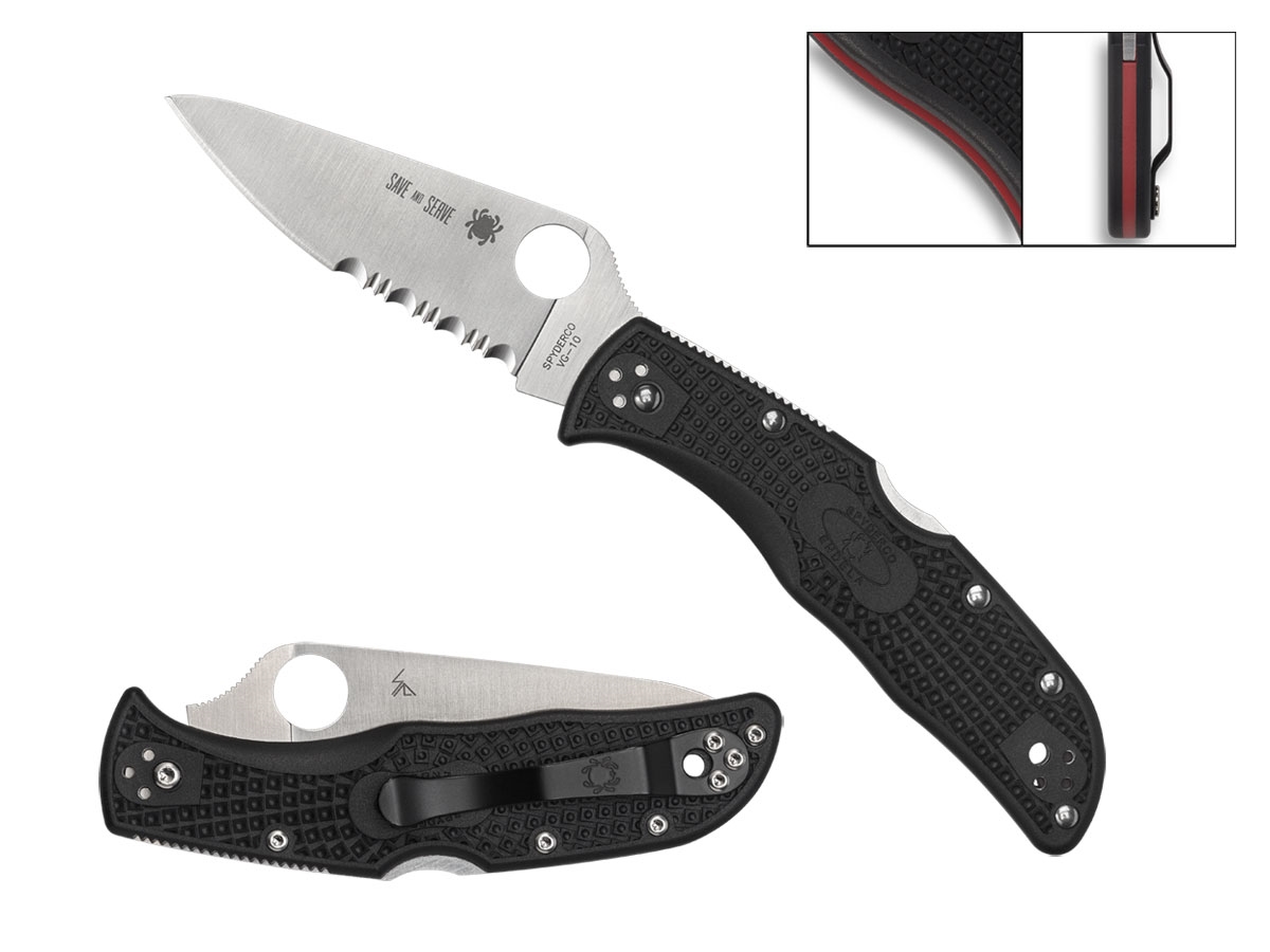 Le guancette nere del manico in nylon rinforzato con fibra di vetro (FRN) e stampate a iniezione sono assemblate con liner in rosso, che crea un'avvincente "linea sottile rossa". A differenza della versione standard di questo modello, la lama in acciaio inossidabile VG-10 ha una molatura completamente piatta ed ha inciso al laser il motto "Save and Serve".