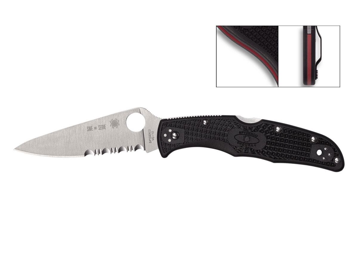 Le guancette nere del manico in nylon rinforzato con fibra di vetro (FRN) e stampate a iniezione sono assemblate con liner in rosso, che crea un'avvincente "linea sottile rossa". A differenza della versione standard di questo modello, la lama in acciaio inossidabile VG-10 ha una molatura completamente piatta ed ha inciso al laser il motto "Save and Serve".
