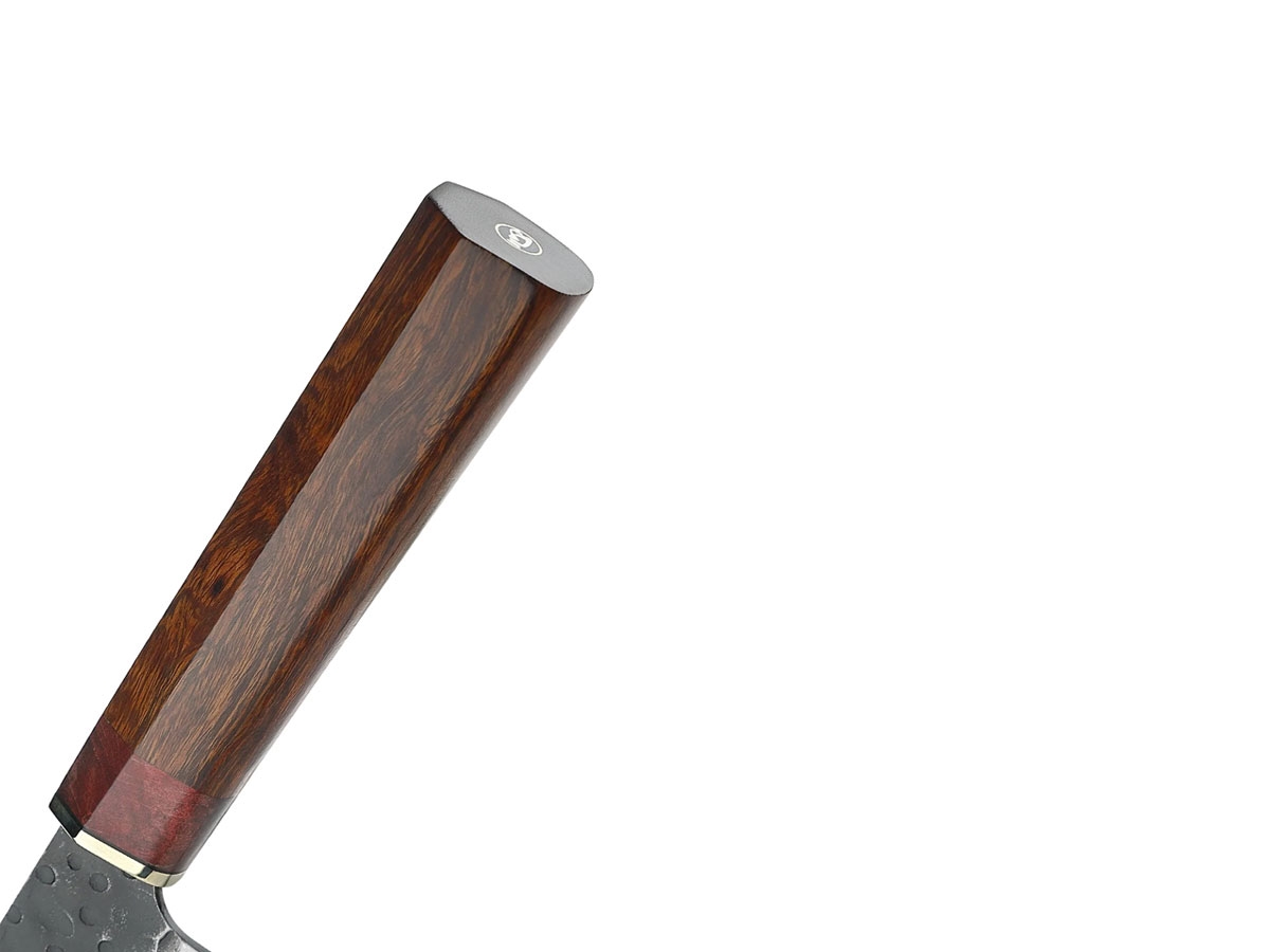 La lama San Mai ha un acciaio inox centrale 440C, con elevata durezza di 59±1 Rockwell, e acciaio inox 410 per i bordi esterni con una buona resistenza alla corrosione. La finitura TSUCHIME martellata e acidata aiuta a rilasciare facilmente il cibo durante il taglio. Per rendere l'impugnatura resistente alla corrosione è stato usato Ironwood stabilizzato, Ironwood naturale e distanziatore in ottone.