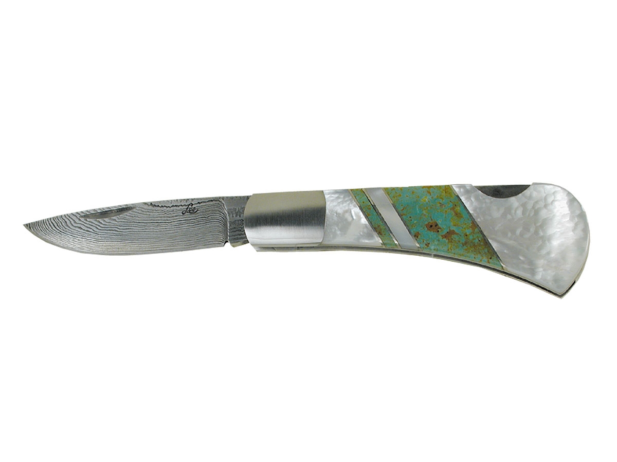 Santa Fe Stoneworks DAMASCUS FOLDERDamascus Folder LEEFL filo pianoLama: damascata Manico: mosaico di pietre su entrambe le guancette L.tot.: cm.18