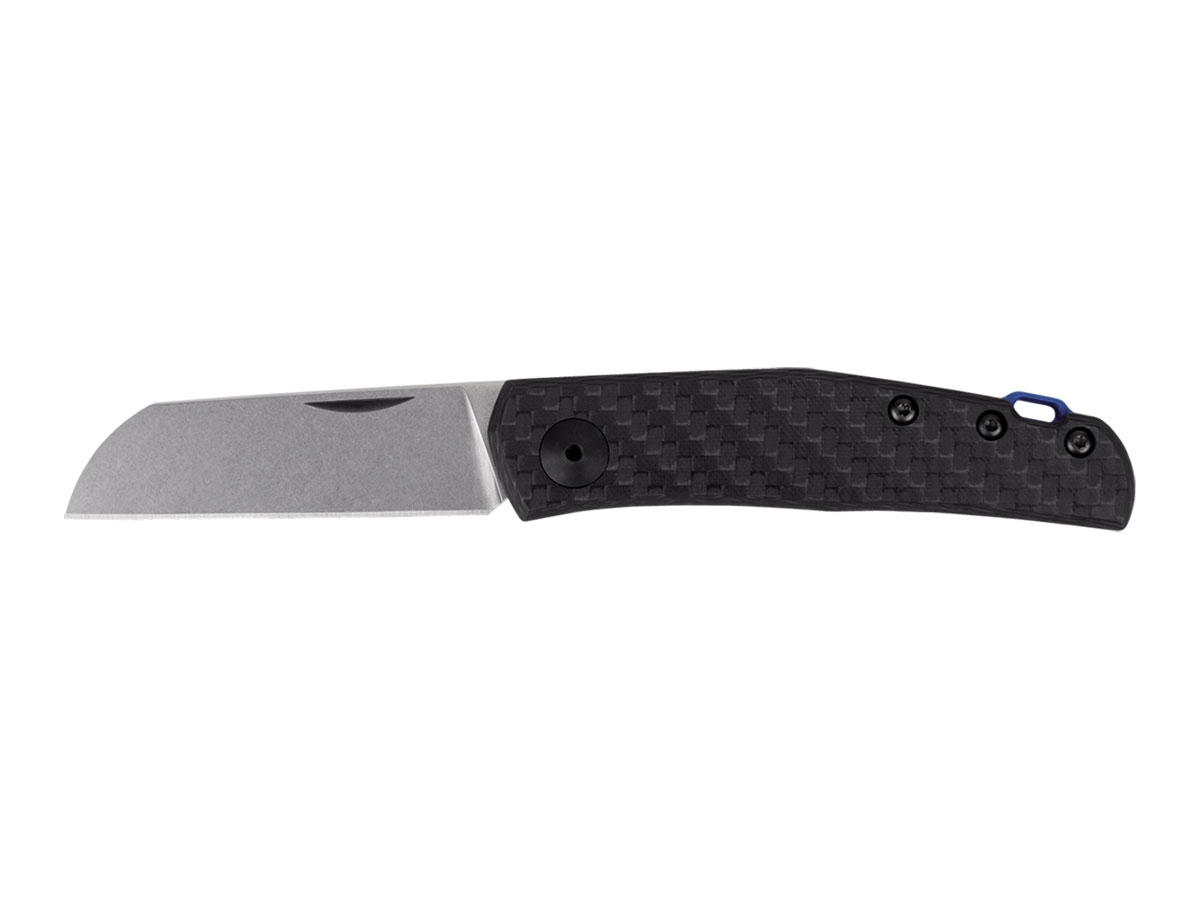 La lama ha un CPM 20CV che offre eccezionale durezza, resistenza all'usura, ritenzione dei bordi la finitura stone washed aiuta a nascondere i graffi. Questo coltello slip-joint presenta un doppio sistema di arresto: due sfere in acciaio, una su ciascun lato della lama, permettono di tenere la lama chiusa in modo sicuro. I backspacer sono in alluminio anodizzato blu ed hanno un attacco per un cordino. Il manico ultraleggero è in fibra di carbonio.