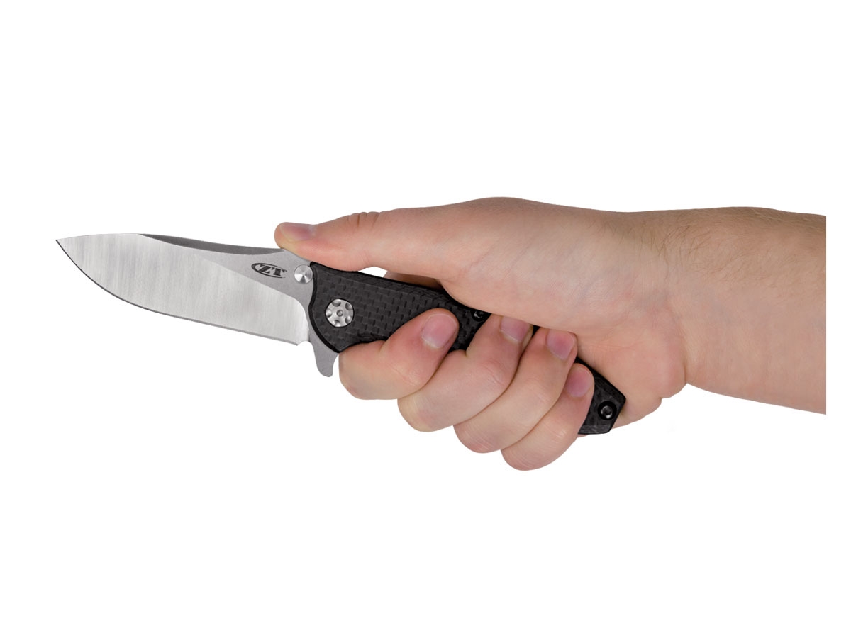 La lama ha un filo delicato per affettare, ma supporta anche la punta della lama per renderla eccellente per il piercing. L'impugnatura dello 0562CF ha una guancetta anteriore in fibra di carbonio e una posteriore in titanio stonewashed. Per un blocco sicuro durante l'uso, ZT utilizza un blocco del telaio con inserti della barra di blocco in acciaio temprato e stabilizzazione della barra di blocco.