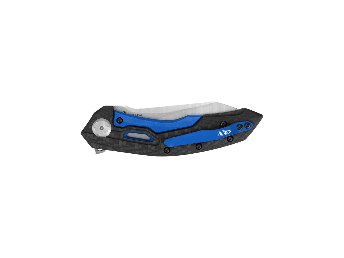 La sua lama tanto inversa e le guancette del manico in fibra di carbonio offrono il massimo per uno ZT di medie dimensioni. Si apre in modo affidabile con lo ZT Tuned Detent System (TDS™), che consente alla lama di dispiegarsi anche con la pressione sulla barra di bloccaggio. Lo ZT Sub-Frame Lock assicura la lama in posizione senza sacrificare il vantaggio di leggerezza della fibra di carbonio. Una lama CPM 20CV bicolore è piacevole alla vista e altrettanto utile durante le attività lavorative. La 0762 si distingue per una serie di dettagli estetici, tra cui l'hardware anodizzato blu abbinato e le eleganti finestre del manico. L'apertura avviene tramite un cuscinetto a sfera KVT ed un flipper.