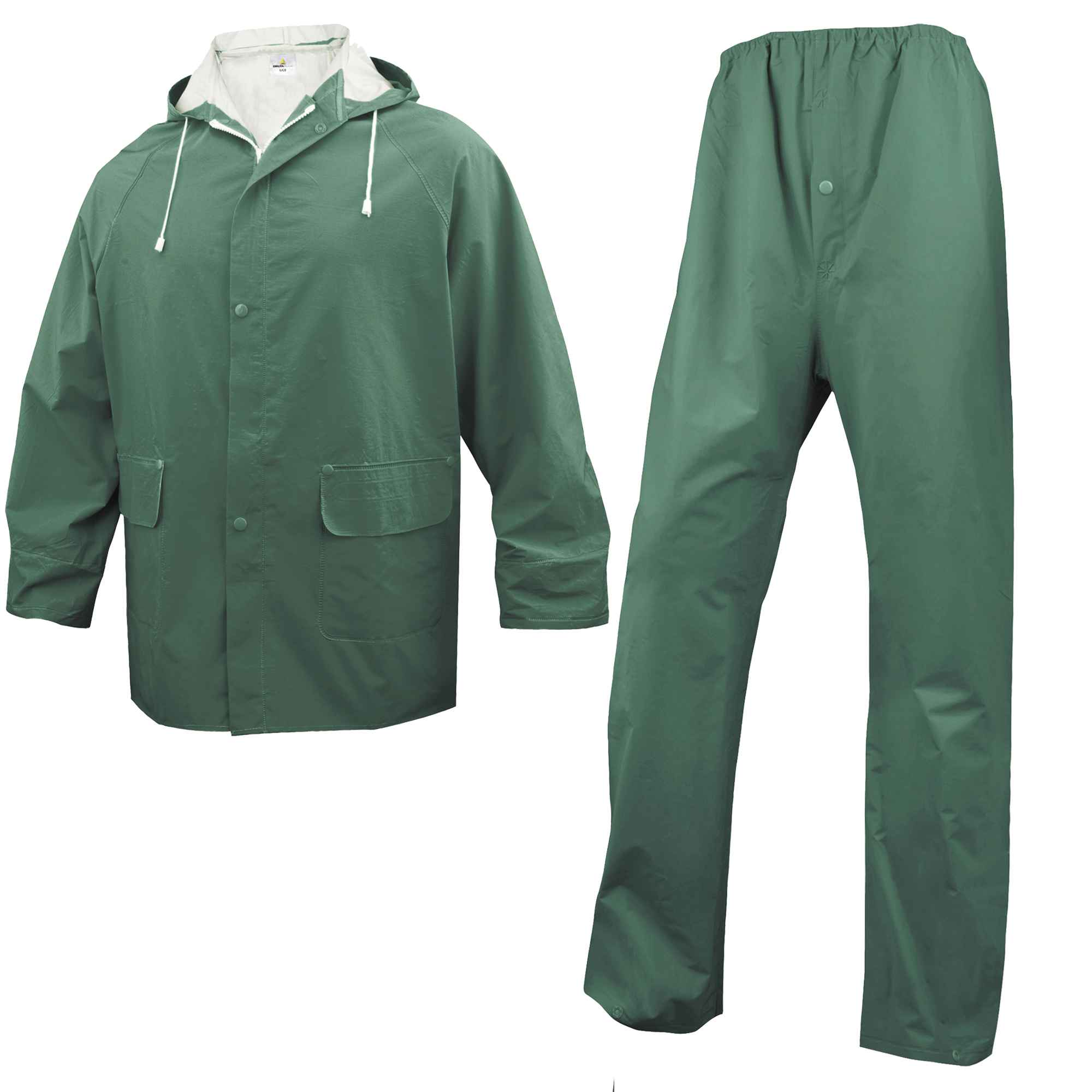 COMPLETO DA PIOGGIA GIACCA + PANTALONE. POLIESTERE CON SPALMATURA INTERNA ED ESTERNA IN PVC CUCITURE SALDATE. GIACCA CON CAPPUCCIO FISSO E CHIUSURA ZIP ANTIFREDDO. PANTALONE CON ELASTICO IN VITA E BOTTONI A PRESSIONE IN FONDO ALLE GAMBE. CATEGORIA DPI: 2. CERTIFICAZIONE CE. CONFORMITA' ALLE NORME EN ISO 13688:2013 E EN343:2003 A1:2007.
