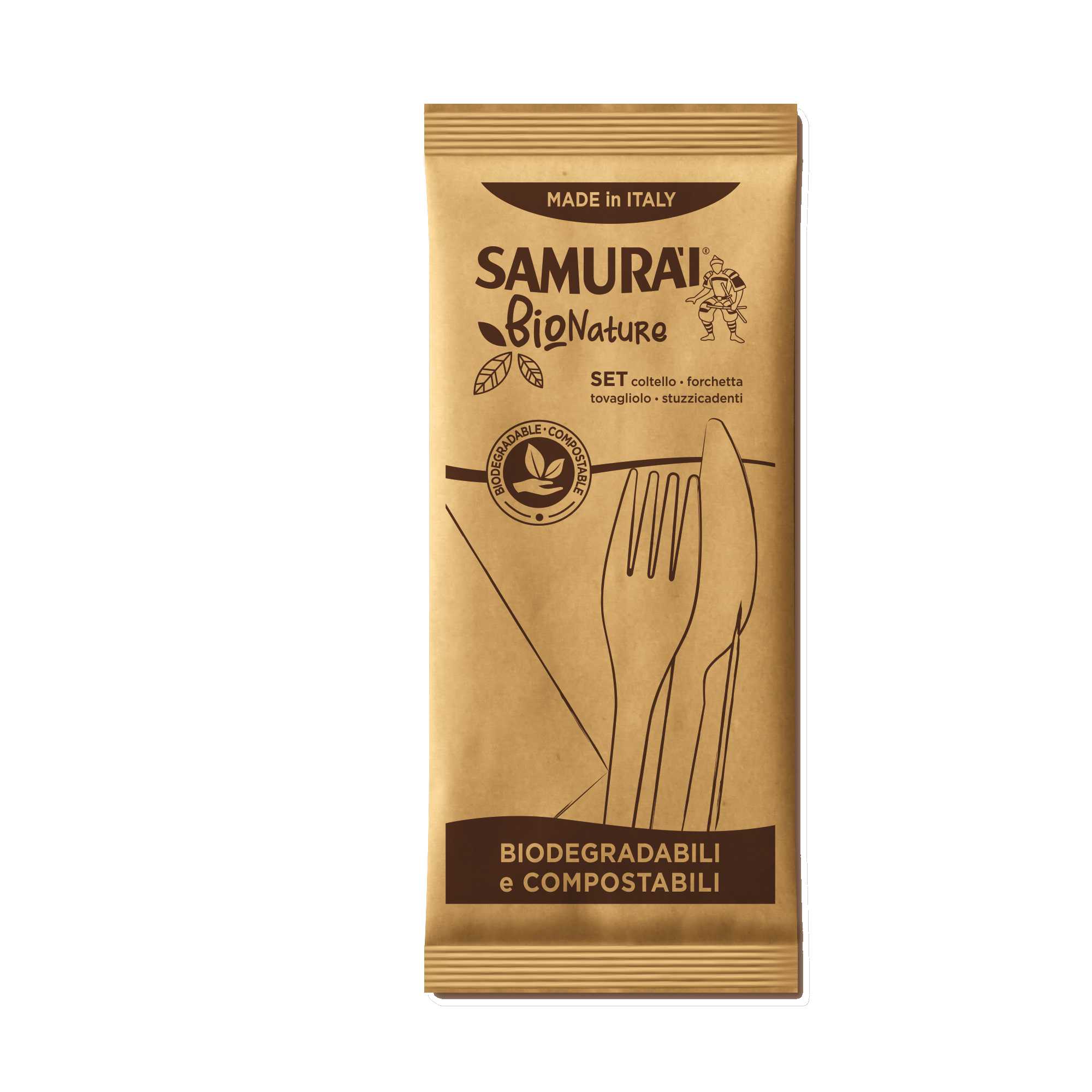 Conf. 100 Bis coltello forchetta PLA con stuzzicadenti e tovagliolo Samurai