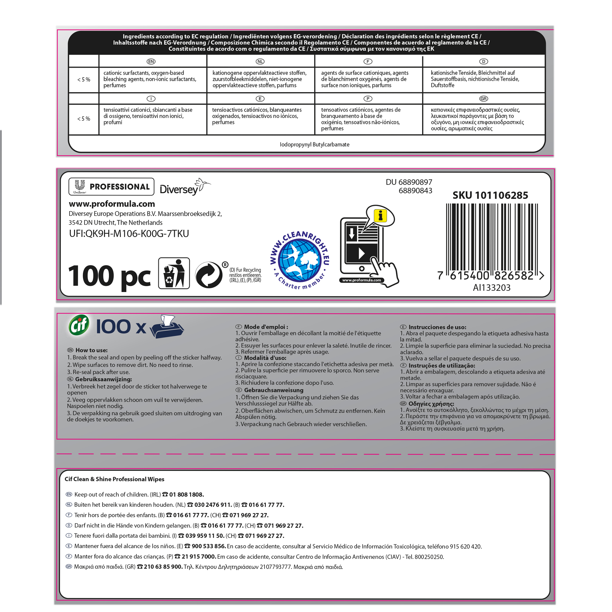 CIF PRO FORMULA CLEAN E SHINE SONO SALVIETTE DETERGENTI E IGIENIZZANTI, IDEALI PER UNA PULIZIA EFFICACE E VELOCE DI TUTTE LE SUPERFICI DURE, RIMUOVENDO ANCHE LO SPORCO MENO VISIBILE. SONO LA SOLUZIONE FACILE DA USARE E VELOCE PER PULIRE ANCHE LE SUPERFICI DIFFICILI DA TRATTARE, QUALI INTERRUTTORI, TELECOMANDI, MANIGLIE E CESTINI DELLA SPAZZATURA. LO SMALTIMENTO DOPO L’USO E' FACILE E VELOCE. UTILI ANCHE PER TUTTE LE ALTRE SUPERFICI DURE E LAVABILI.