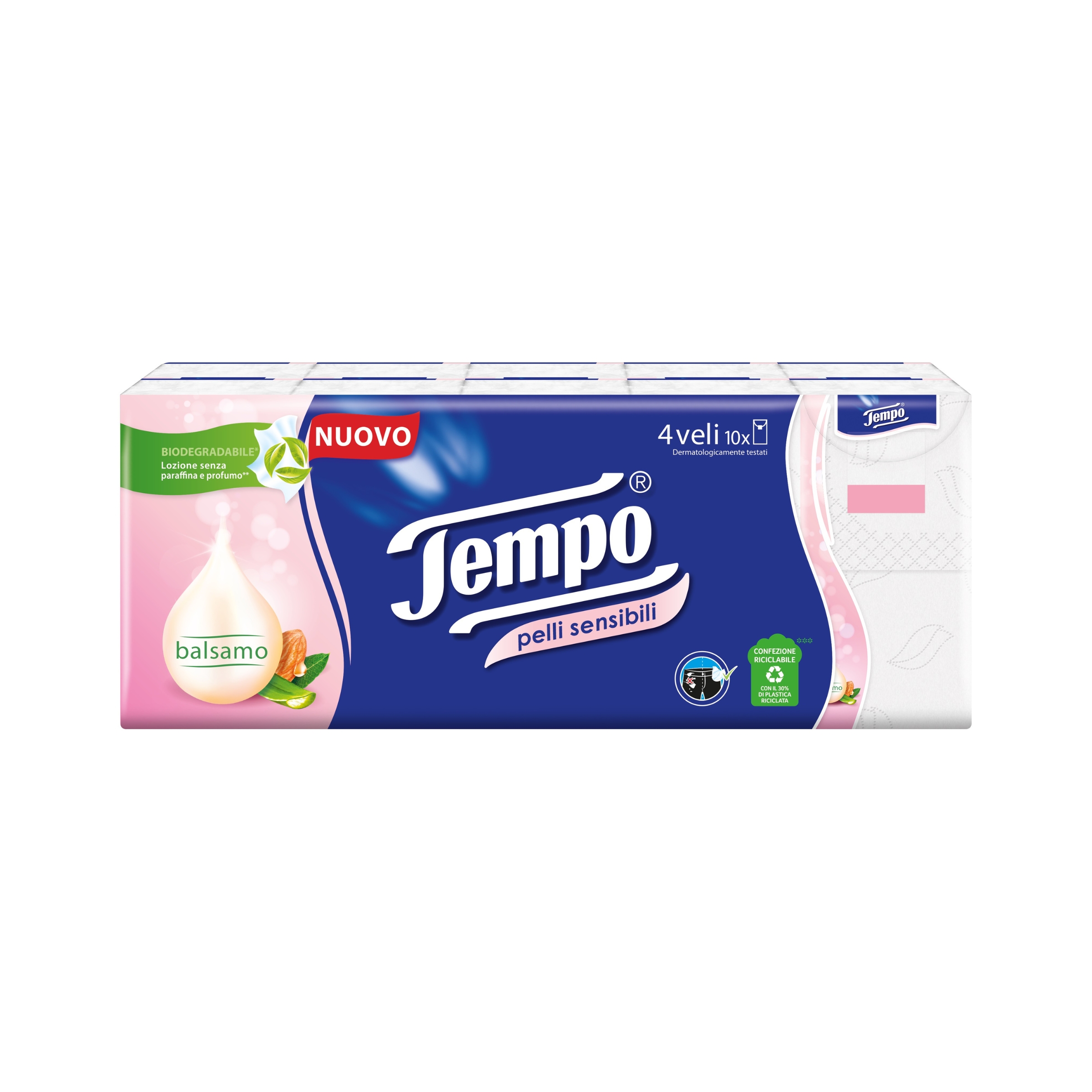Scopri i fazzoletti Tempo per Pelli Sensibili, progettati appositamente per offrire un'esperienza ultra-delicata e rispettosa delle pelli più sensibili. Questi fazzoletti combinano morbidezza e resistenza, ideali per chi cerca sollievo durante il raffreddore, le allergie stagionali o per uso quotidiano.• Massima Delicatezza: Arricchiti con estratti di aloe vera e olio di mandorle, noti per le loro proprietà emollienti, questi fazzoletti offrono un tocco estremamente morbido che minimizza gli effetti dello sfregamento continuo, proteggendo la pelle sensibile.• Composizione Ipoallergenica: La loro lozione è priva di paraffina e profumi, rendendo i fazzoletti ideali per chi ha la pelle sensibile o chi si soffia frequentemente il naso.• Resistenza in Lavatrice: Non devi preoccuparti di danneggiamenti accidentali in lavatrice, poiché questi fazzoletti sono progettati per mantenere la loro integrità anche dopo il lavaggio.• Sostenibilità Ambientale: Oltre ad essere biodegradabili, i fazzoletti sono confezionati in materiali riciclabili che includono il 30% di plastica riciclata, riducendo sprechi e impatto ambientale.• Certificazione FSC: Realizzati con fibre provenienti da fonti gestite in modo responsabile e certificati FSC, assicurando che l'approvvigionamento delle materie prime sia sostenibile.• Dermatologicamente Testati: Garantiti per essere delicati e sicuri, questi fazzoletti hanno superato rigorosi test dermatologici.La Confezione di 10 Pacchetti di Fazzoletti Tempo per Pelli Sensibili è l'ideale per chi cerca un prodotto affidabile e gentile per la cura quotidiana del naso e della pelle, offrendo comfort e protezione quando più ne hai bisogno.