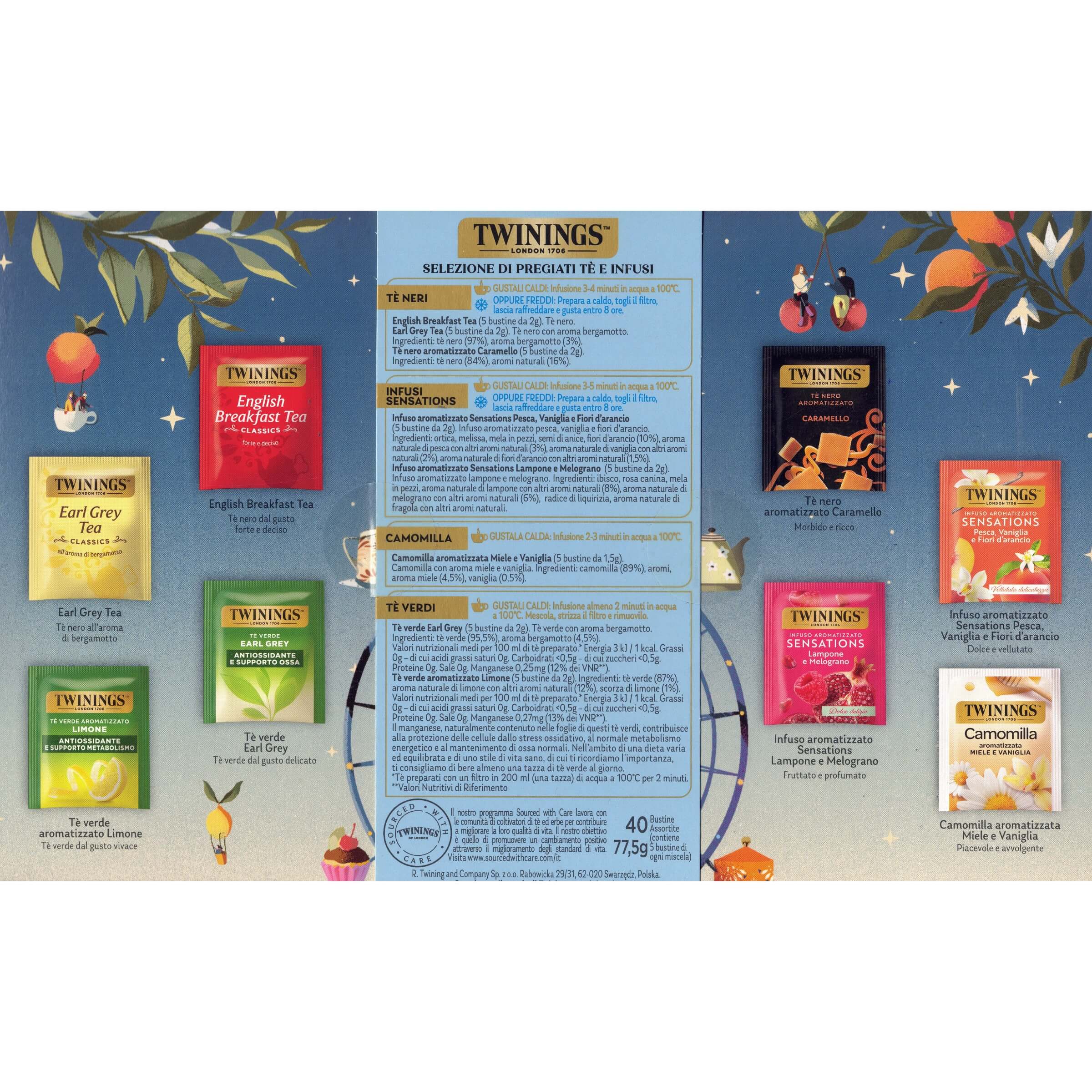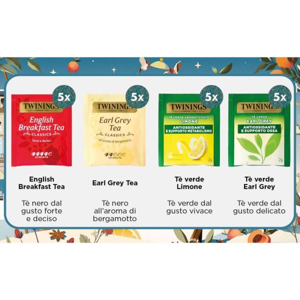Ogni tazza della Selezione Twinings è un piccolo rituale che unisce profumi e sensazioni diverse. La varietà delle miscele consente di scegliere il gusto più adatto a ogni momento della giornata: energizzante al mattino, distensivo nel pomeriggio, rilassante alla sera. Perfetta per gli amanti del tè e per chi desidera un dono elegante e raffinato, questa confezione rappresenta l’essenza dello stile Twinings, dove gusto, qualità e benessere si fondono in un’esperienza unica.