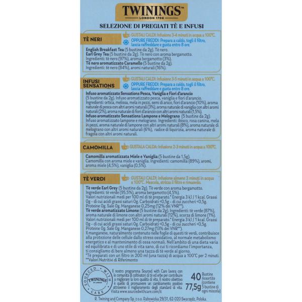 • Filosofia Twinings: Dal 1706, Twinings seleziona con cura i migliori tè del mondo, seguendo una tradizione che combina passione artigianale e ricerca costante della qualità. L’azienda sostiene pratiche etiche e sostenibili nelle coltivazioni, promuovendo un approccio responsabile verso l’ambiente e le comunità produttrici.