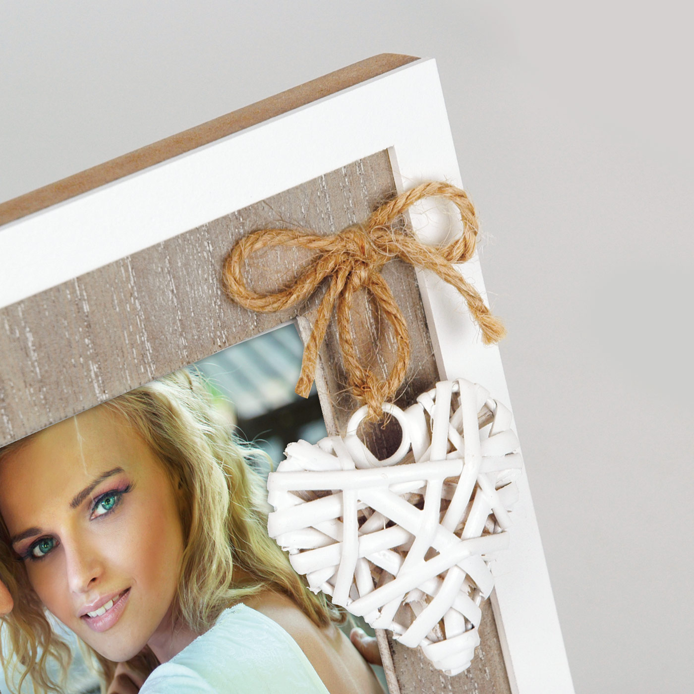 Cornice Bercy in legno, colore marrone e bianco , da tavolo o da parete, con decoro a forma di cuore in 3D, disponibile in vari formati, adatta al tema dell'amore. Cornice in legno MISURA FOTO (cm) 10x15 COLORE Bianco / marrone SPESSORE CORNICE (cm) 1 MISURA ESTERNA (cm) 16 x 21 LARGHEZZA ASTA (cm) 3,5 MISURA EST. (cm) C/SCATOLA 17 x 22 x 3,5 PESO con scatola (gr) 295 ORIENTAMENTO IMMAGINE Verticale/orizzontale UTILIZZO Da tavolo e da parete RETRO Mdf PARTICOLARITÀ Con decoro a forma di cuore in 3D e fiocco PACKAGING Scatola