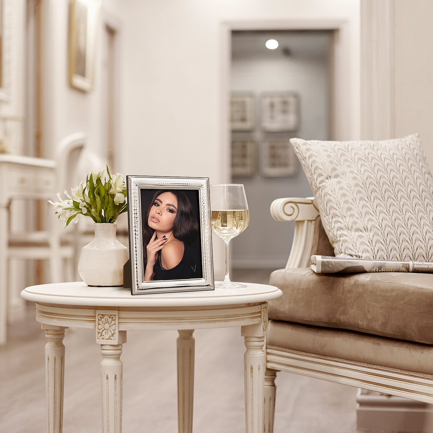 Cornice Recanati in metallo, prodotta in italia, con finitura silver plated lucida, profilo decorato a rilievo, effetto elegante e classico, retro in legno, da tavolo, disponibile in vari formati, ideale per celebrare anniversari o compleanni, adatta per regali preziosi o importanti.