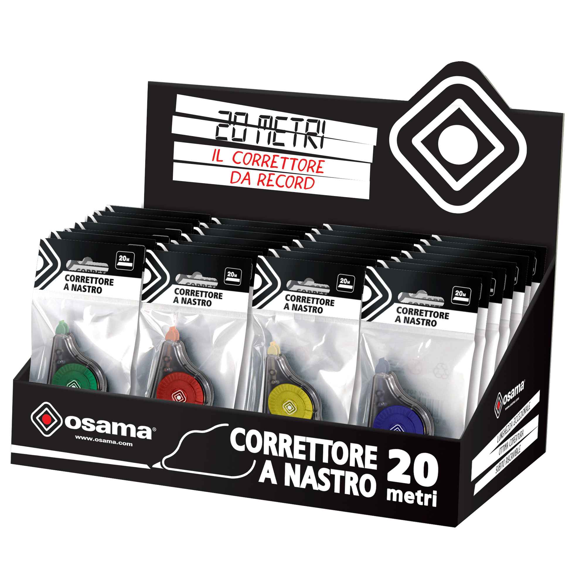 CORRETTORE A NASTRO DA 20 METRI X 5MM. OTTIMA COPERTURA, SUBITO RISCRIVIBILE, PER OGNI TIPO DI CARTA, FRIZIONE TENDI NASTRO, IMPUGNATURA ERGONOMICA. CORPO TRASPARENTE PER IL CONTROLLO DEL NASTRO CON INSERITI NEI COLORI: BLU, ROSSO, GIALLO, VERDE.