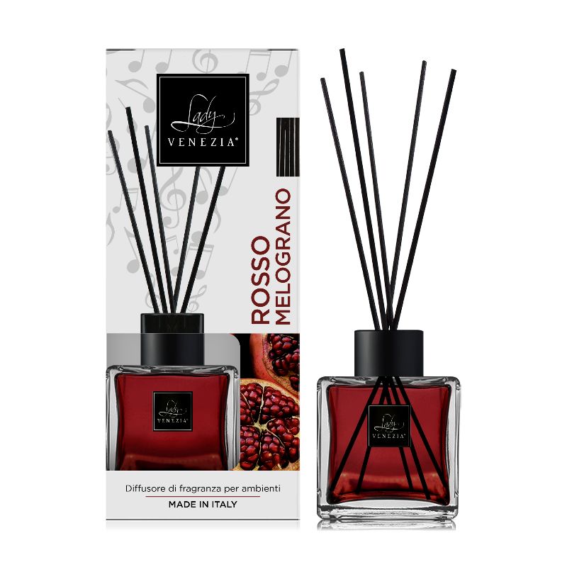 Il Profumatore per Ambiente Lady Venezia è un diffusore la cui fragranza viene rilasciata attraverso i bastoncini che, immersi nel liquido, la assorbono e la diffondono con costanza.Le nuove confezioni in stile minimal, con flacone cubico trasparente in vetro e bastoncini neri, sono ancora più eleganti, rendendosi adatti a qualsiasi tipo di ambiente e arredamento.Modo d'uso: sollevare il tappo diffusore e svitare il tappo di sicurezza. Appoggiare nuovamente il tappo diffusore sul collo del flacone e inserire i bastoncini all'interno dello stesso. Se la fragranza risulta troppo intensa, diluire con un paio di cucchiai di acqua.Confezioni da 100 mlMADE IN ITALY
