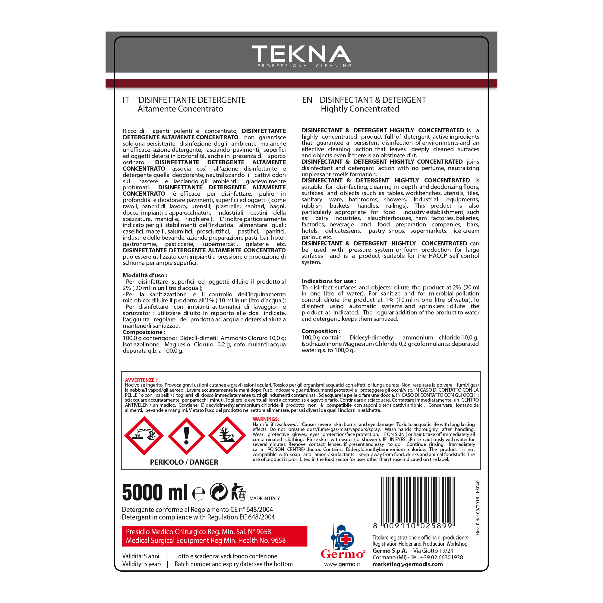 Disinfettante detergente per superfici super concentrato 5lt Tekna