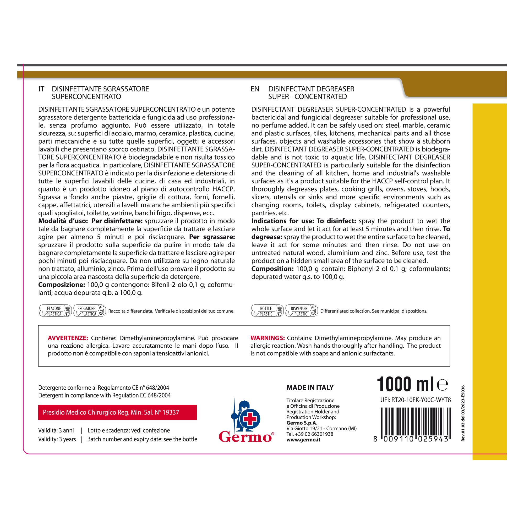 DISINFETTANTE SGRASSATORE, SUPERCONCENTRATO, NON PROFUMATO CON TRIGGER. CERTIFICAZIONE PRESIDIO MEDICO CHIRURGICO E HACCP. POTENTE SGRASSATORE BATTERICIDA E FUNGICIDA IDEALE PER FORNI E FORNELLI, LAVANDINI, CELLLE FRIGO, PIANI DI LAVORO E OGNI SUPERFICIE CHE VA A CONTATTO CON GLI ALIMENTI. SGRASSA E DISINFETTA CONTEMPORANEAMENTE SUPERFICI, ACCESSORI E PARTI MECCANICHE IN ACCIAIO, PLASTICA, MARMO E CERAMICA. BIODEGRADABILE, NON CONTIENE FOSFATI E NON E' TOSSICO PER LA FLORA ACQUATICA.