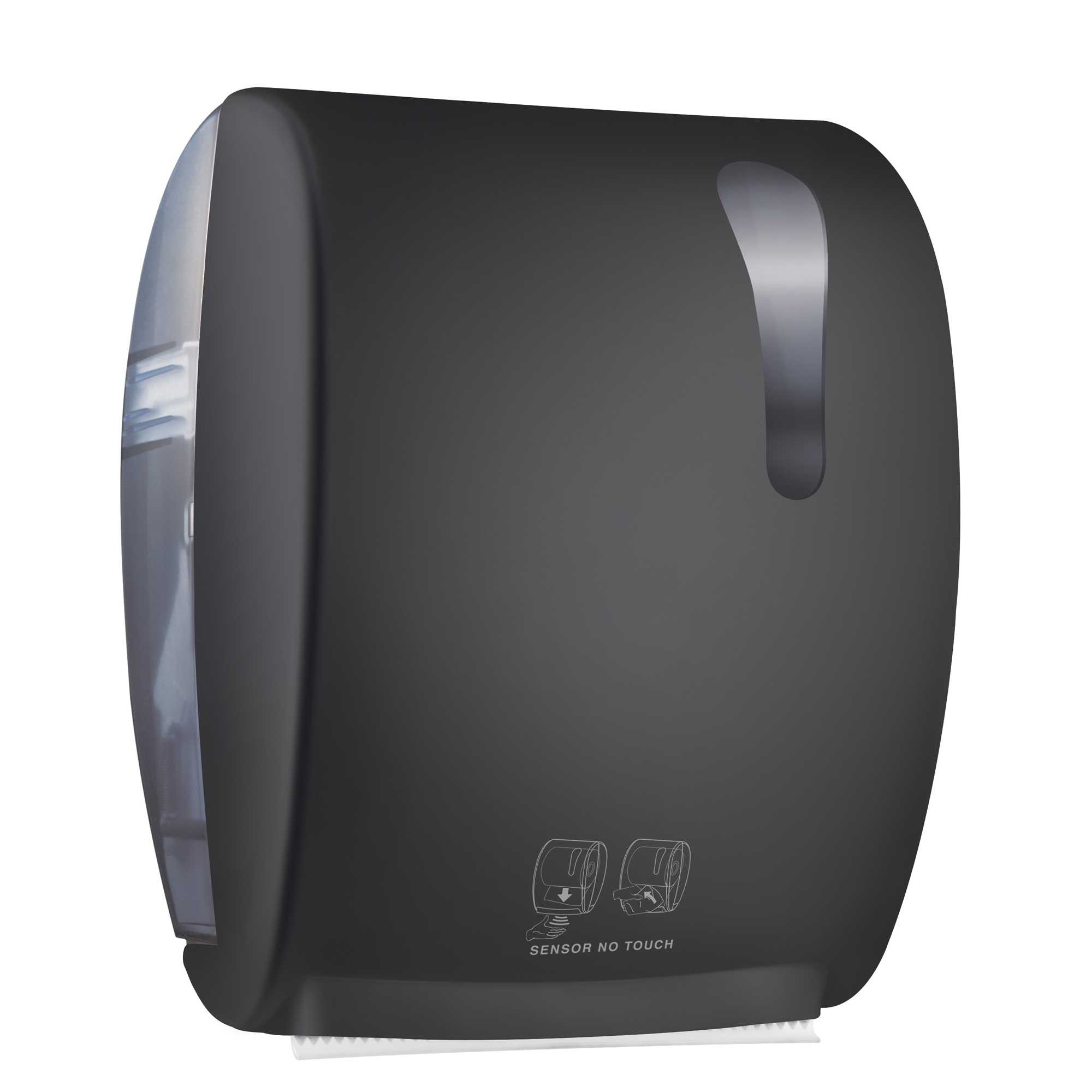 DISPENSER IN ABS AD EROGAZIONE CON RILEVATORE DI PROSSIMITA' E TRASCINAMENTO ELETTRONICO (FUNZIONA CON 4 PILE D). CAPACITA' MAX BOBINA ASCIUGAMANI: H220MM -DMAX 200MM. MECCANISMO REGOLABILE: LUNGHEZZA DI STRAPPO, RITARDO TRA UN'EROGAZIONE E L'ALTRA E RANGE DEL SENSORE. L'UTENTE, AVVICINANDO LE MANI AL DISPENSER, ATTIVA IL RILEVATORE DI PROSSIMITA'. SI AZIONE IL TRASCINAMENTO ELETTRICO DEL ROTOLO (3 REGOLAZIONI: 25, 35 E 45CM.). L'UTENTE SI RITROVA UN LEMBO DA TIRARE VERSO DI SE, CHE SI TAGLIA CON UN SEGHETT