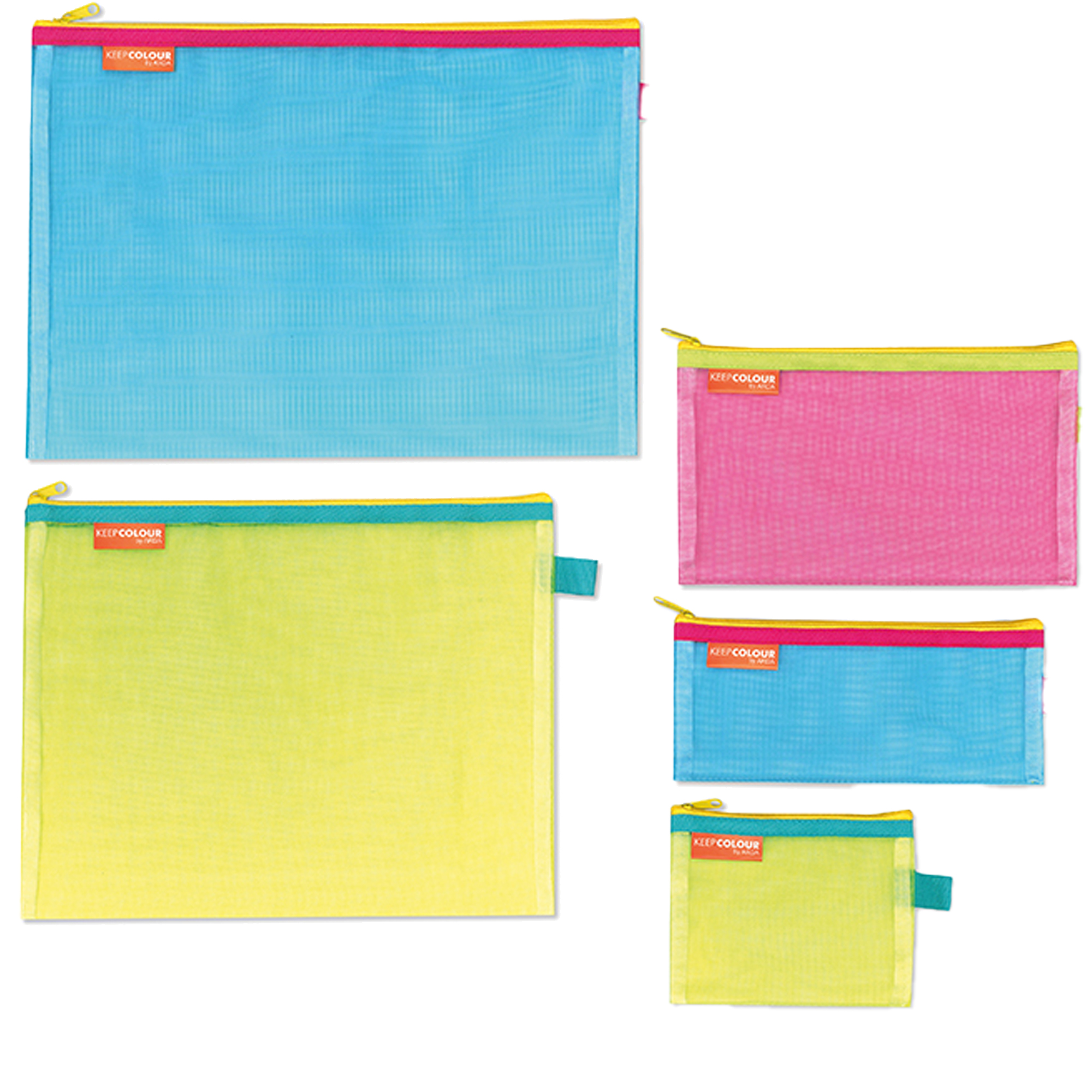DISPLAY DA BANCO CON 36 BUSTE IN RETINA C/ZIP. 6 PZ A4, 6 PZ 23X30CM, 12 PZ 23X13CM, 6 PZ 21X8,5CM, 6PZ 14X10,5CM IN COLORI FLUO ASSORTITI.