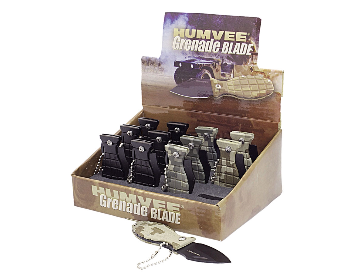 Nel display box in cartone sono inclusi 12 coltellini "Grenade": 6 neri, 3 camo sabbia e 3 camo verde.