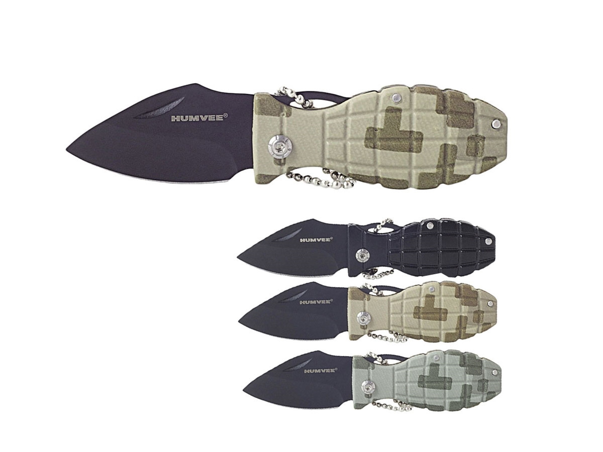 Nel display box in cartone sono inclusi 12 coltellini "Grenade": 6 neri, 3 camo sabbia e 3 camo verde.