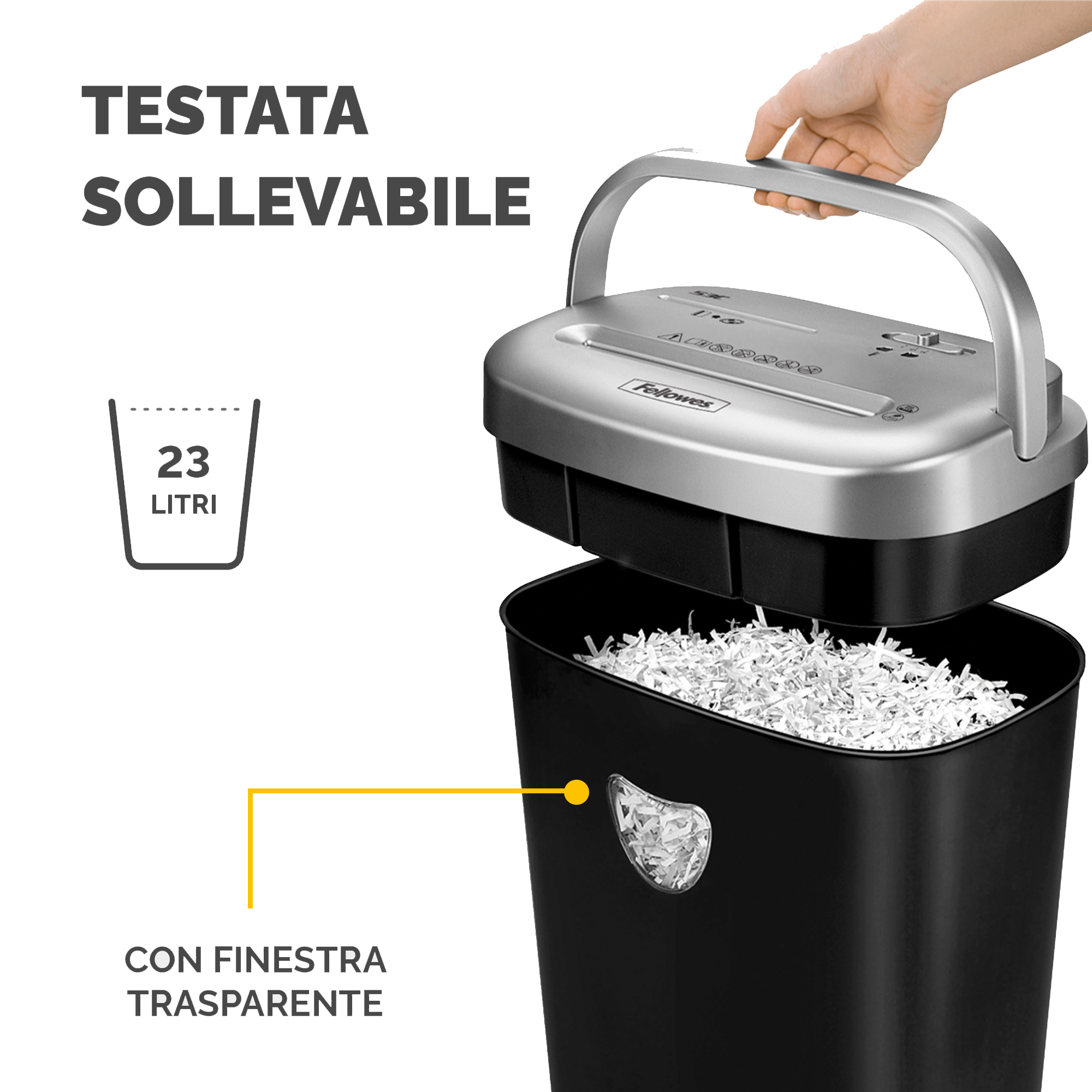 DISTRUGGIDOCUMENTI PER USO PERSONALE OCCASIONALE. TAGLIO A FRAMMENTO: 4X35MM. IMBOCCATURA: 220MM. CAPACITA' DI TAGLIO 10 FOGLI DA 70 GR / 9 FOGLI DA 80 GR. DIN: P-4. CESTINO DA 23 LITRI CON TESTATA FACILMENTE SOLLEVABILE. EFFICIENTE E POTENTE, IN GRADO DI DISTRUGGERE ANCHE CD. CICLO DI LAVORO: 3 ON / 30 OFF. LIVELLO RUMOROSITA' 70 -75 DB. DISTRUGGE GRAFFETTE, PUNTI METALLICI, CARTE DI CREDITO E CD. DIMENSIONI 40 X 33,8 X 19,6CM. PESO 6,8KG.