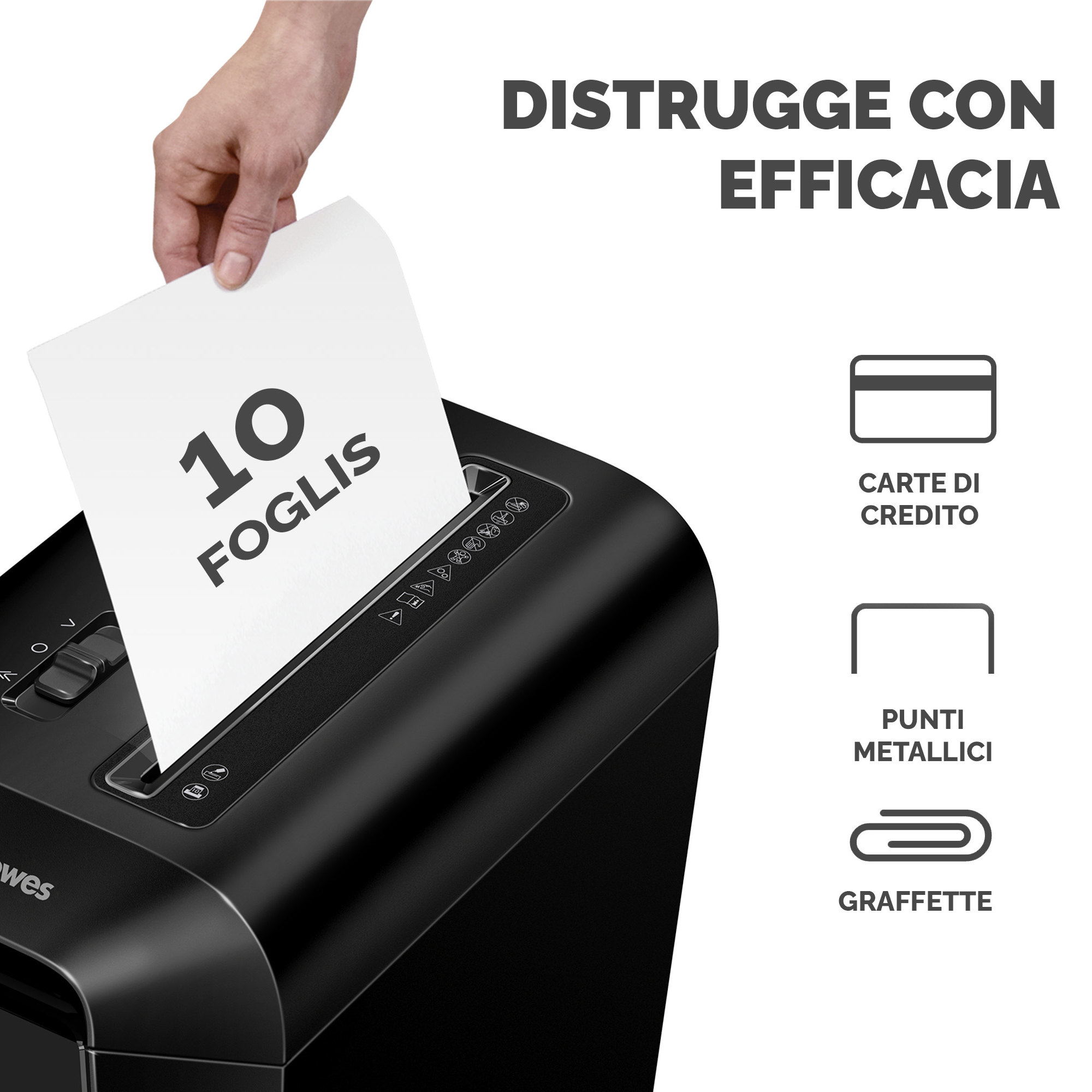 Distruggidocumenti LX65, per uso regolare a casa e in ufficio. Distrugge fino a 10 fogli in frammenti da 4x40mm (Livello DIN P-4 La tecnologia brevettata SafeSense ferma la distruzione se le mani toccano l'imboccatura della carta. Distrugge ininterrottamente fino a 6 minuti seguiti da 20 minuti di raffreddamento. Cestino da 22 litri con testata sollevabile. Distrugge anche graffette, punti metallici e carte di credito. Per uso individuale. Garanzia: 2 anni machina / 5 anni lame