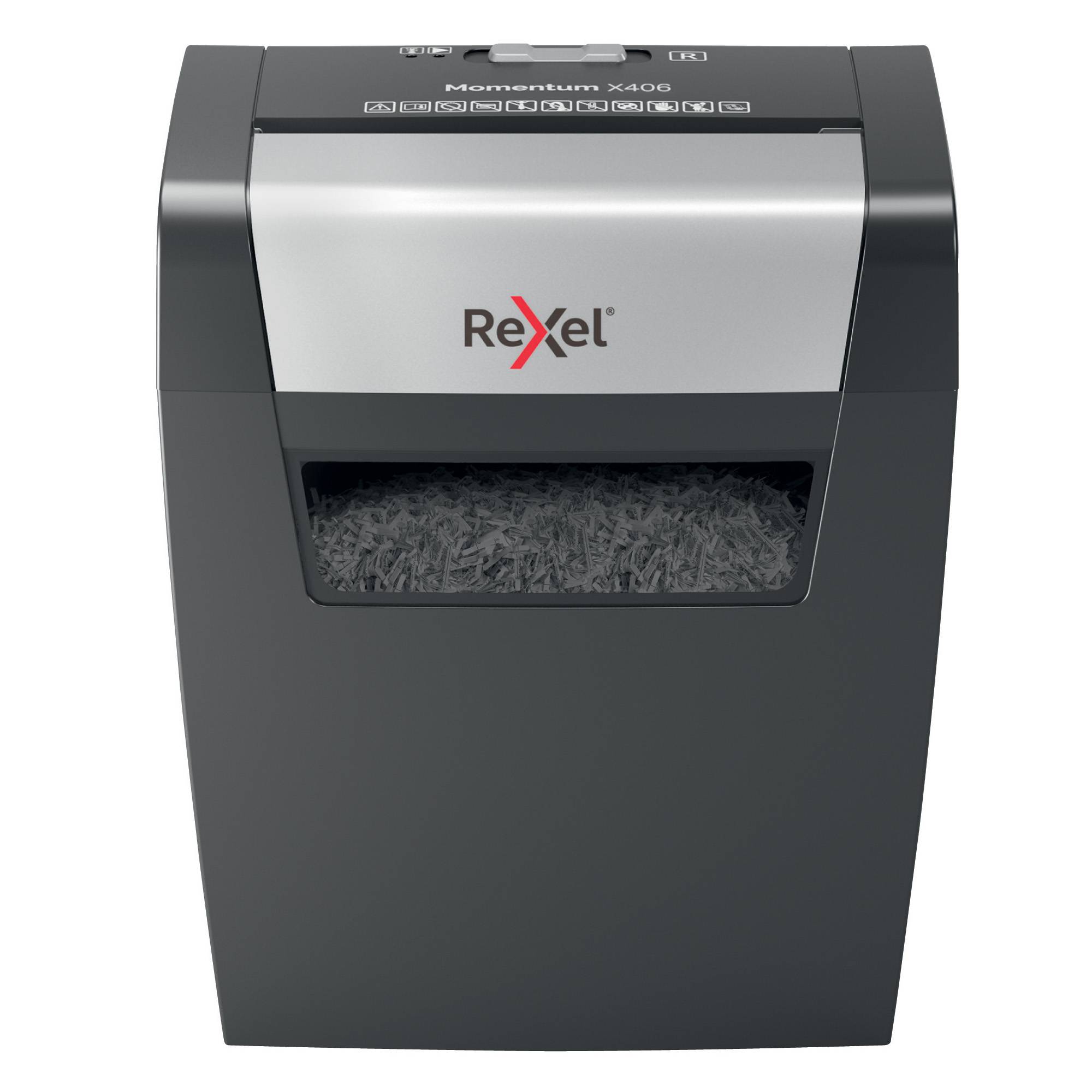 IL POTERE DI DISTRUGGERE DI PIU'! REXEL MOMENTUM X406 DISTRUGGE FINO A 6 FOGLI PER VOLTA CON UN CICLO DI LAVORO CONTINUO DI 3 MINUTI CHE LO RENDE IDEALE PER L'USO A CASA. LIVELLO DI SICUREZZA P4 CON TAGLIO A FRAMMENTI DA 4X30 MM. CAPACITA' DEL CESTINO DA 15 LITRI (125 FOGLI A4)