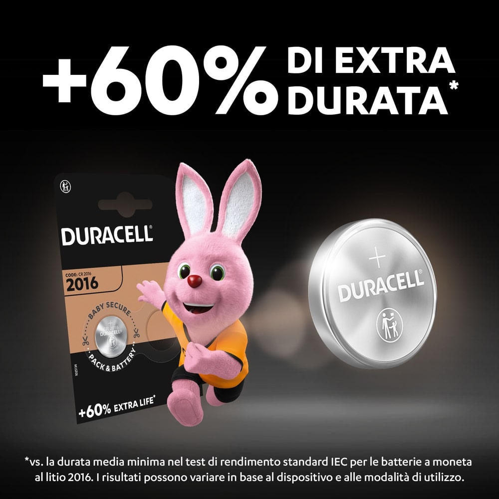 Le batterie Duracell Specialistiche a moneta al litio 2016 sono prodotte con litio ad alta purezza per offrire ai tuoi dispositivi fino al 60% di energia in più* (*rispetto alla durata media minima nel test di rendimento secondo lo standard IEC per le batterie a moneta al litio 2016. I risultati possono variare in base al dispositivo e alle modalità di utilizzo). Garantiscono fino a 10 anni di durata se correttamente conservate nella confezione, così avrai la sicurezza di avere le tue batterie pronte all'uso quando ne avrai bisogno. Per una maggiore sicurezza dei bambini e per proteggerli dal rischio di ingestione, Duracell ha sviluppato la Tecnologia Baby Secure, ricoprendo il lato posteriore della batteria con uno strato dal sapore disgustoso, e progettando una confezione "a prova di bambino", con doppio imballo rinforzato impossibile da aprire a mani nude, senza forbici. Sono adatte ad essere utilizzate in chiavi per auto, piccoli telecomandi, bilance, accessori, sensori, dispositivi medici (glucometri, termometri digitali), dispositivi sportivi (monitor per frequenza cardiaca, accessori per biciclette).