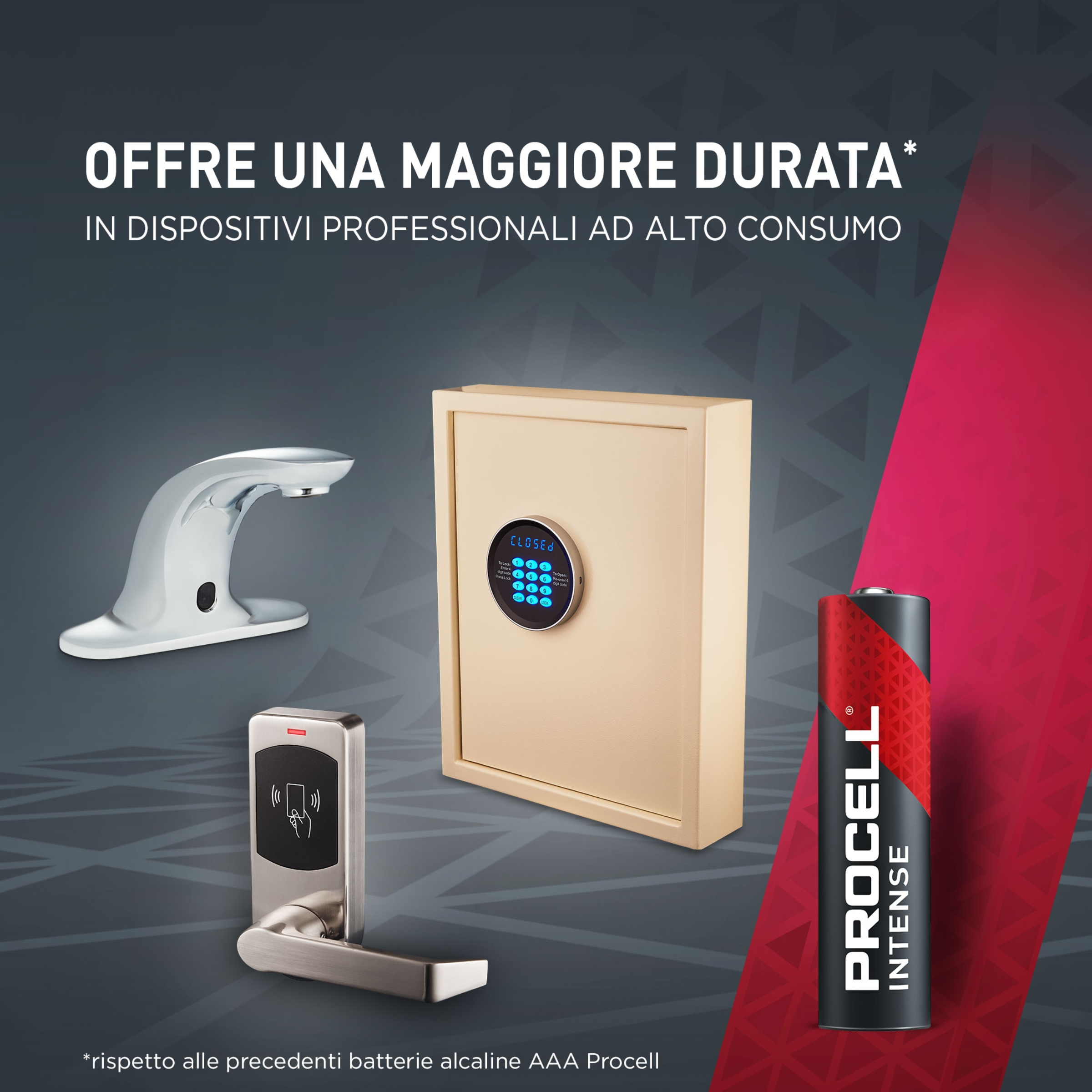 Le batterie alcaline Procell Intense AAA, 1.5V, rappresentano la soluzione energetica ottimale per quei dispositivi professionali che richiedono un alto consumo energetico o sono soggetti a picchi di domanda energetica. Grazie alla loro formula avanzata, queste batterie sono progettate per offrire una durata superiore rispetto alle precedenti batterie alcaline AAA Procell, garantendo così prestazioni affidabili e costanti nel tempo.Caratteristiche Principali:• Durata Prolungata: Specificamente sviluppate per dispositivi ad alto consumo, come monitor per il controllo della pressione sanguigna, dispenser di sapone e torce elettriche, le Procell Intense AAA garantiscono una maggiore durata, riducendo la necessità di frequenti sostituzioni.• Risparmio Energetico e Operativo: Il passaggio alla combinazione di batterie Procell – Procell Constant per dispositivi a basso consumo e Procell Intense per quelli ad alto consumo permette di risparmiare fino al 20% rispetto alla concorrenza e di utilizzare fino al 20% in meno di batterie, contribuendo così a ottimizzare i costi operativi.• Qualità Garantita: Prodotte seguendo un design avanzato delle celle, queste batterie alcaline AAA assicurano elevate prestazioni e sono garantite per 10 anni di stoccaggio, dimostrando l'impegno di Procell nella realizzazione di prodotti di alta qualità.• Standard Elevati: Il design, la sicurezza, la fabbricazione e la qualificazione delle batterie Procell Intense AAA rispettano rigorosi standard industriali, inclusi quelli ANSI e IEC, confermando l'affidabilità e la sicurezza del prodotto.• Gestione dell'Inventario: Confezionate in lotti adatti alla vendita all'ingrosso e dotate di un codice individuale con data, queste batterie facilitano una gestione efficace dell'inventario, consentendo agli utenti professionali di pianificare con precisione le sostituzioni.• Versatilità di Utilizzo: Procell collabora strettamente con i produttori per garantire che le sue batterie alcaline funzionino al meglio nei dispositivi professionali, rendendole la scelta preferita da aziende in tutto il mondo.Operando efficacemente in un ampio intervallo di temperature, da -20 °C a 54 °C, le batterie Procell Intense AAA sono l'opzione ideale per garantire l'alimentazione di dispositivi professionali in qualsiasi condizione ambientale, promettendo affidabilità e costanza nelle prestazioni.