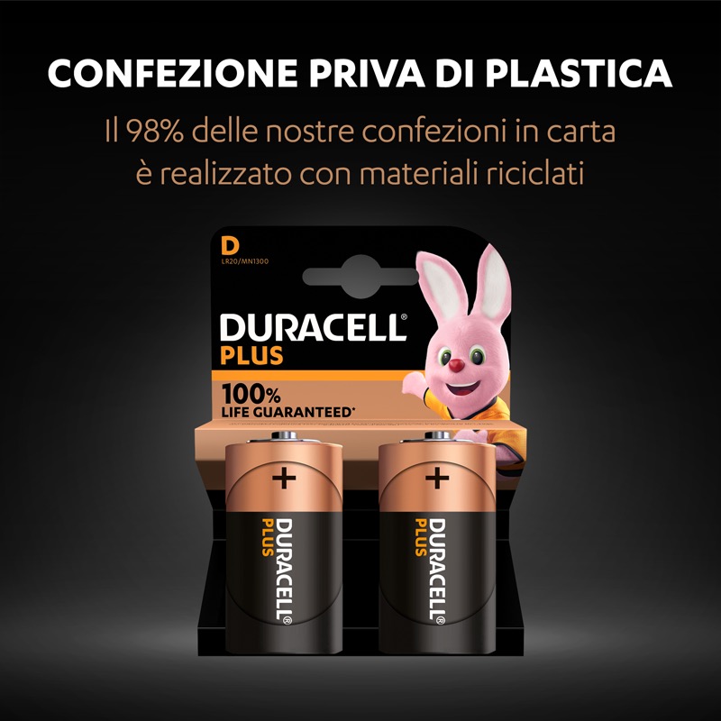 Duracell offre un'ampia gamma di batterie da usare in dispositivi elettronici che richiedono energia affidabile. Le batterie Duracell Plus D sono batterie alcaline ideali per alimentare tutti i tuoi dispositivi e offrono il 100% di energia garantita* (*garanzia commerciale rispetto alla durata minima media nei test 2015 IEC sulle batterie di formato D; i risultati possono variare a seconda del dispositivo e del tipo di utilizzo (sito web IEC)). Le batterie Duracell non utilizzate garantiscono una durata fino a 10 anni, se correttamente conservate nella confezione. Nel 1969 Duracell partecipa alla missione Apollo 11 e diventa la prima batteria ad andare sulla luna.