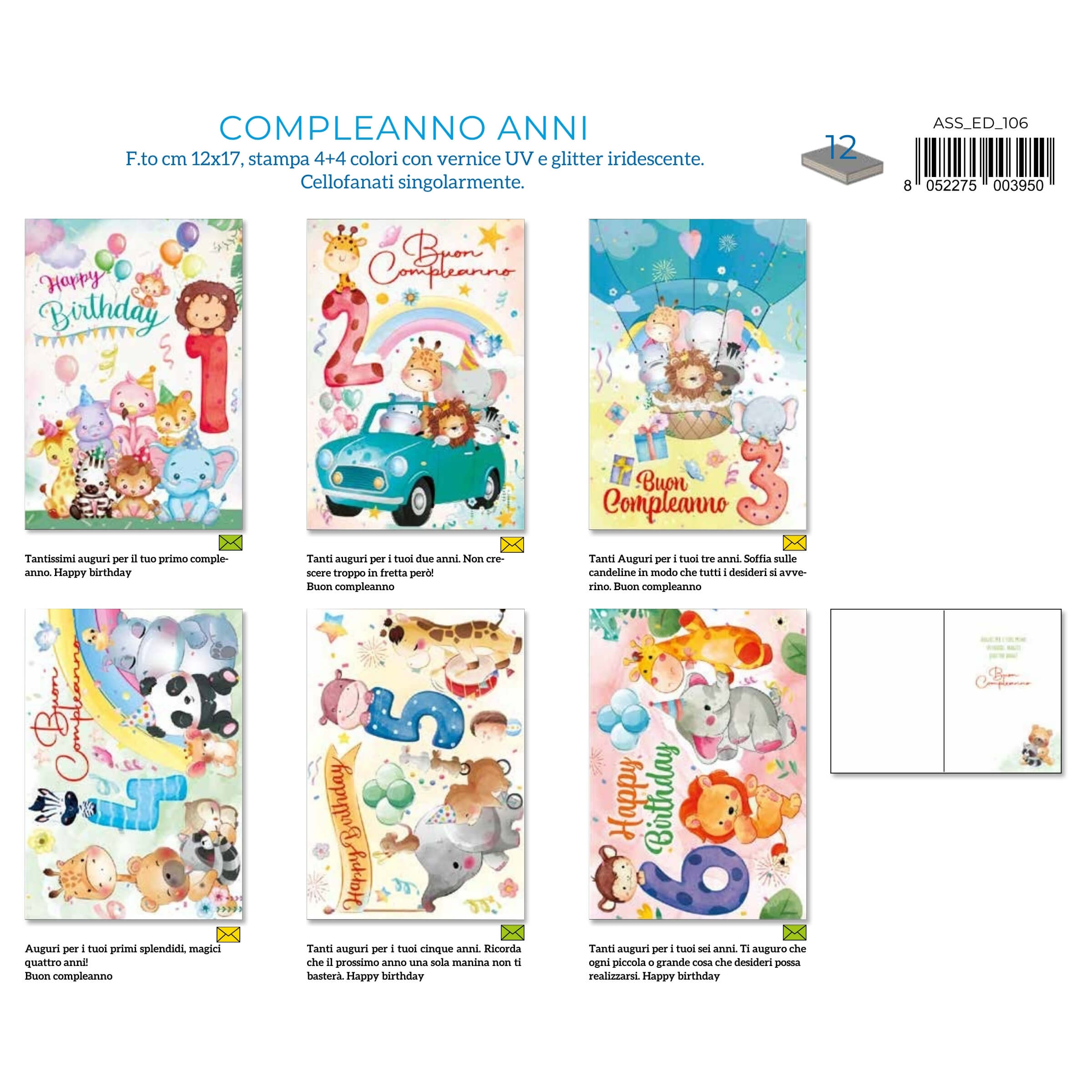 ED-106 BIGLIETTI COMPLEANNO ANNI VERNICE UV E GLITTER (12PZ)