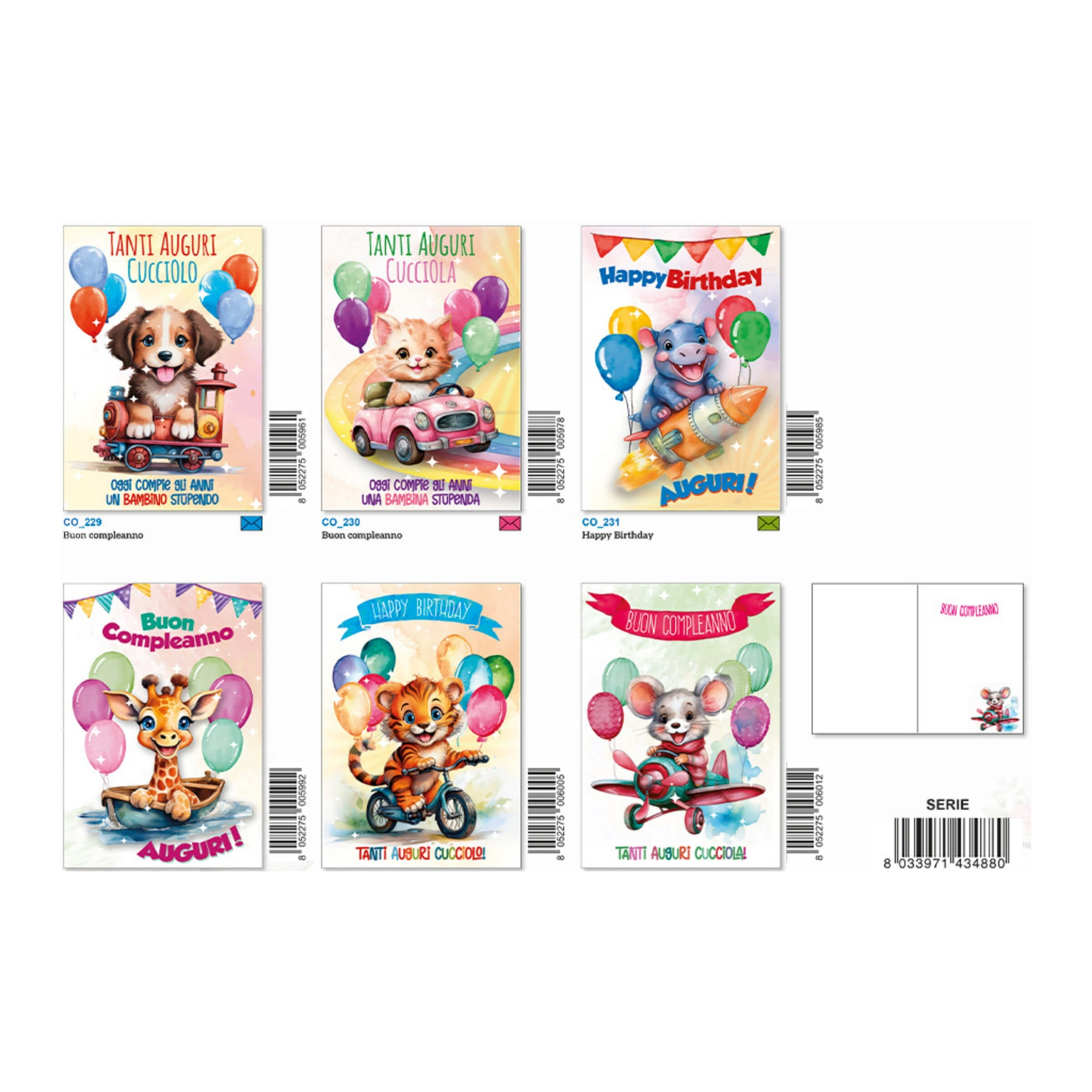 I biglietti augurali Compleanno Fantasia Cuccioli ED-118 sono una collezione dolce, colorata e ricca di dettagli scintillanti, perfetta per festeggiare i compleanni dei più piccoli con allegria e tenerezza. Ogni biglietto raffigura adorabili cuccioli in ambientazioni giocose e vivaci, accompagnati da palloncini, veicoli e decorazioni festose, per trasmettere gioia e affetto in modo spontaneo e genuino. Grazie alla vernice UV e ai glitter iridescenti, ogni soggetto brilla alla luce, rendendo il biglietto un piccolo capolavoro da conservare come ricordo del giorno speciale.• Design allegro e tenero: Le illustrazioni raffigurano simpatici animaletti – cagnolini, gattini, tigrotti e altri cuccioli – immersi in atmosfere festose e colorate, ideali per bambini e bambine di tutte le età.• Effetto luminoso con glitter iridescente: I dettagli decorativi, come palloncini, scritte e contorni, sono impreziositi da riflessi brillanti che donano un effetto magico e gioioso, catturando l’attenzione dei più piccoli.• Stampa di alta qualità 4+4 colori: Ogni biglietto è realizzato con stampa ad alta definizione che valorizza le sfumature, la luminosità e la profondità delle illustrazioni, mantenendo un aspetto vivido e di grande impatto visivo.• Finitura lucida con vernice UV: La vernice protettiva UV aggiunge brillantezza e resistenza, rendendo il biglietto più durevole e di qualità superiore.• Confezione assortita e pronta alla vendita: Ogni confezione contiene 12 biglietti assortiti in 6 soggetti diversi, tutti cellofanati singolarmente con busta coordinata, perfetti per espositori da cartoleria o negozi di articoli regalo.La serie Compleanno Fantasia Cuccioli ED-118 è pensata per rendere ogni compleanno un momento indimenticabile, pieno di colori e sorrisi. Ideali per bambini, genitori e amici che desiderano regalare un pensiero dolce e luminoso, questi biglietti uniscono la simpatia dei personaggi illustrati alla qualità tipica dei prodotti Edicart.