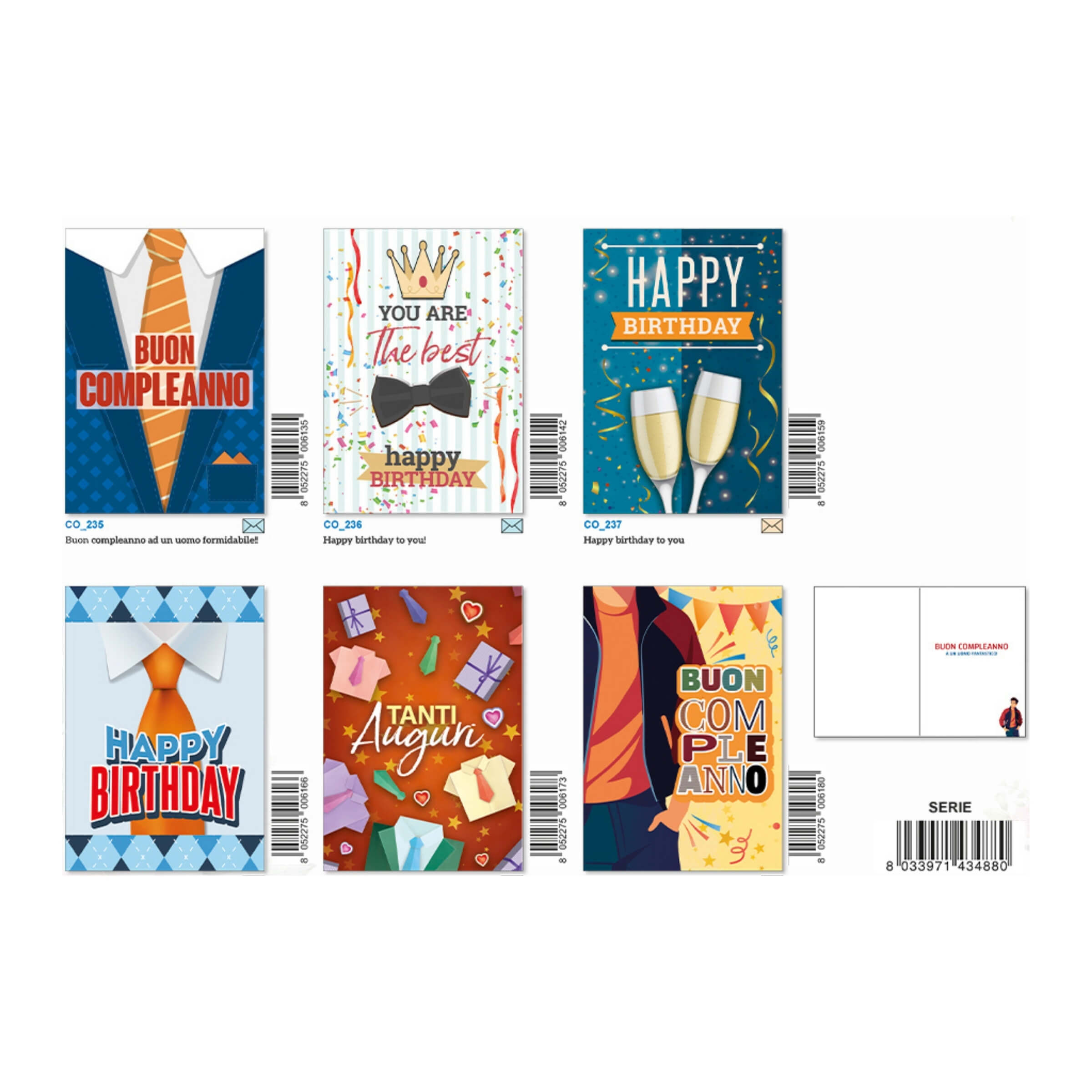 I biglietti Buon Compleanno Uomo ED-120 sono una collezione moderna e curata, pensata per celebrare con stile e originalità i compleanni maschili. Ogni biglietto unisce un design elegante e vivace con un messaggio positivo e diretto, perfetto per trasmettere auguri sinceri in modo raffinato ma allegro. Le grafiche si ispirano a elementi maschili come cravatte, camicie, brindisi e accessori, valorizzate da una stampa a 4+4 colori con vernice UV e rilievo che dona profondità e brillantezza ai dettagli. Ideali per cartolerie, tabaccherie e negozi di articoli regalo, questi biglietti offrono un assortimento versatile e accattivante adatto a ogni età.• Design elegante e maschile: I soggetti spaziano da cravatte e giacche a simboli di festa come bicchieri di champagne e pacchetti regalo, con uno stile grafico moderno che combina linee pulite e colori decisi.• Finitura di pregio: Ogni biglietto è stampato con tecnologia a 4+4 colori e impreziosito da vernice UV e rilievo, che esalta i contrasti e aggiunge una percezione tattile di qualità superiore.• Materiale resistente e di qualità: Realizzati su carta spessa e liscia al tatto, i biglietti garantiscono un aspetto raffinato e una lunga durata, mantenendo colori brillanti e dettagli nitidi.• Assortimento vario: Il set include 12 biglietti assortiti in 6 soggetti diversi, ognuno con frasi dedicate come “Buon compleanno ad un uomo formidabile”, “Tanti auguri, resti sempre al top” e “Happy birthday to a special man”.• Confezione singola con busta: Ogni biglietto è cellofanato singolarmente con la propria busta coordinata, per una presentazione ordinata, igienica e pronta alla vendita.La serie Buon Compleanno Uomo ED-120 unisce eleganza e semplicità, perfetta per chi desidera augurare un compleanno con un pensiero curato ma spontaneo. Le illustrazioni raffinate e i toni vivaci trasmettono energia e positività, rendendo ogni biglietto un gesto che lascia il segno.