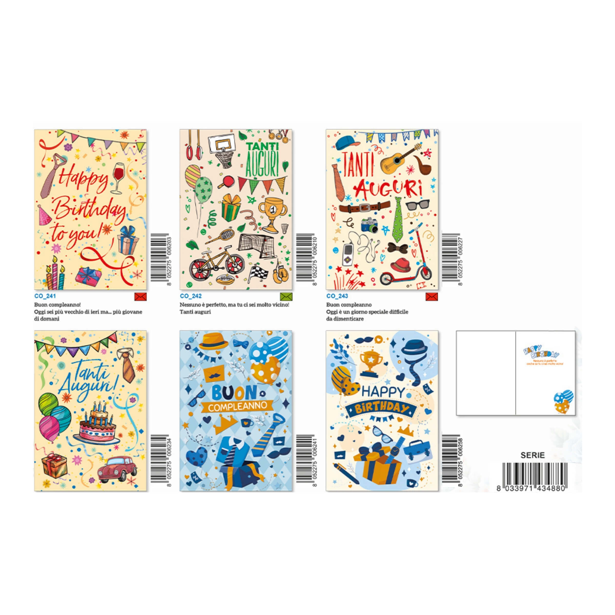 I biglietti augurali Tanti Auguri Uomo ED-121 rappresentano una collezione vivace e contemporanea pensata per celebrare con stile e ironia i compleanni maschili. Ogni soggetto unisce grafiche moderne, colori energici e dettagli dorati che donano al biglietto un tocco raffinato ma al tempo stesso allegro e spensierato. La vernice UV esalta i contrasti e i giochi di luce, mentre l’oro a caldo multicolore aggiunge eleganza e brillantezza, trasformando ogni biglietto in un piccolo oggetto da collezione. Ideali per cartolerie, tabaccherie e negozi di articoli regalo, questi biglietti sono perfetti per chi cerca un augurio dal tono simpatico ma curato.