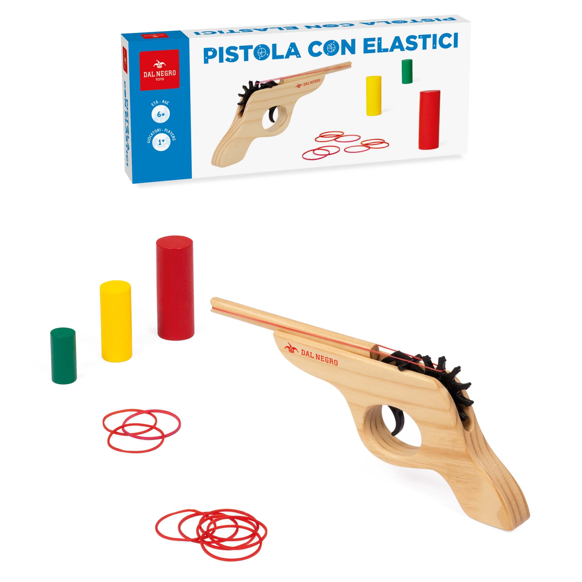 La Pistola con Elastici di Dal Negro offre un divertimento sicuro e innovativo per bambini e adulti. Realizzata interamente in legno, questa pistola gioca su un meccanismo di ingranaggio che utilizza elastici come munizioni, proponendo un approccio giocoso e meno convenzionale al classico gioco del tiro al bersaglio.• Design Unico e Sicuro: La pistola è progettata con un ingranaggio in legno che garantisce funzionalità e sicurezza. L'utilizzo degli elastici come proiettili riduce il rischio di danni o infortuni, rendendo questo gioco adatto a tutte le età.• Bersagli Colorati per il Massimo Divertimento: Inclusi nel set ci sono 3 bersagli colorati, ciascuno con un valore assegnato che aggiunge un elemento competitivo al gioco. I giocatori possono sfidarsi per ottenere il punteggio più alto, migliorando mira e precisione.• Stimolazione delle Abilità Motorie e Cognitive: Oltre a offrire puro divertimento, il gioco stimola lo sviluppo delle abilità motorie fine attraverso l'atto di caricare e sparare la pistola. Inoltre, calcolare i punteggi e mirare ai bersagli incoraggia il pensiero strategico e la concentrazione.• Facile da Usare: La pistola è dotata di un semplice meccanismo di ingranaggio che rende il caricamento e lo sparo degli elastici un'operazione facile e intuitiva. Questo assicura che giocatori di tutte le età possano partecipare senza difficoltà.• Set di Elastici Incluso: Il gioco viene fornito con un set di elastici, assicurando che i giocatori abbiano tutto il necessario per iniziare a divertirsi subito. Gli elastici sono facili da sostituire, garantendo una lunga durata del gioco.La Pistola con Elastici Dal Negro è un'aggiunta eccellente a qualsiasi collezione di giochi, offrendo un'alternativa sicura e divertente al tradizionale tiro al bersaglio. Perfetta per le giornate all'aperto, le feste o come passatempo familiare, questa pistola in legno promette ore di divertimento e sfide amichevoli.