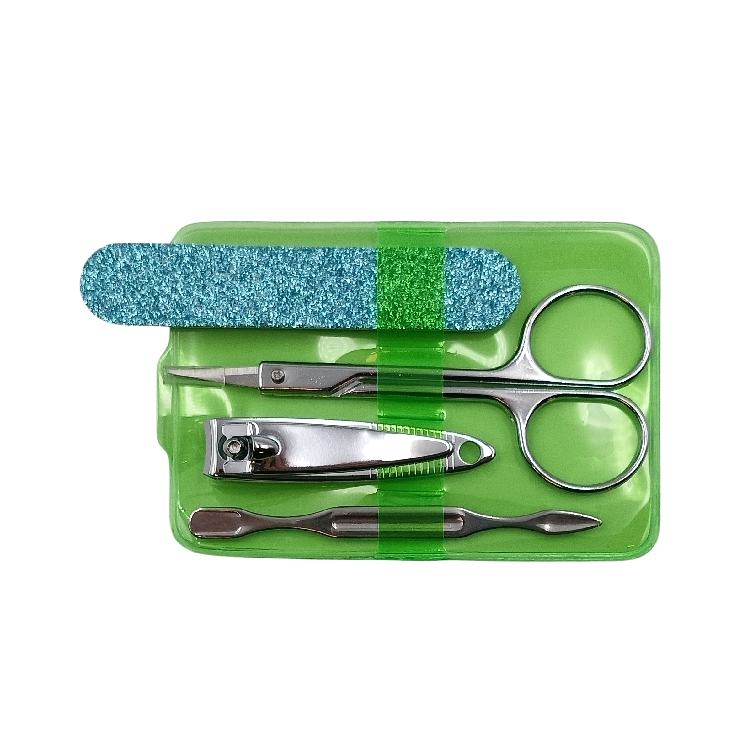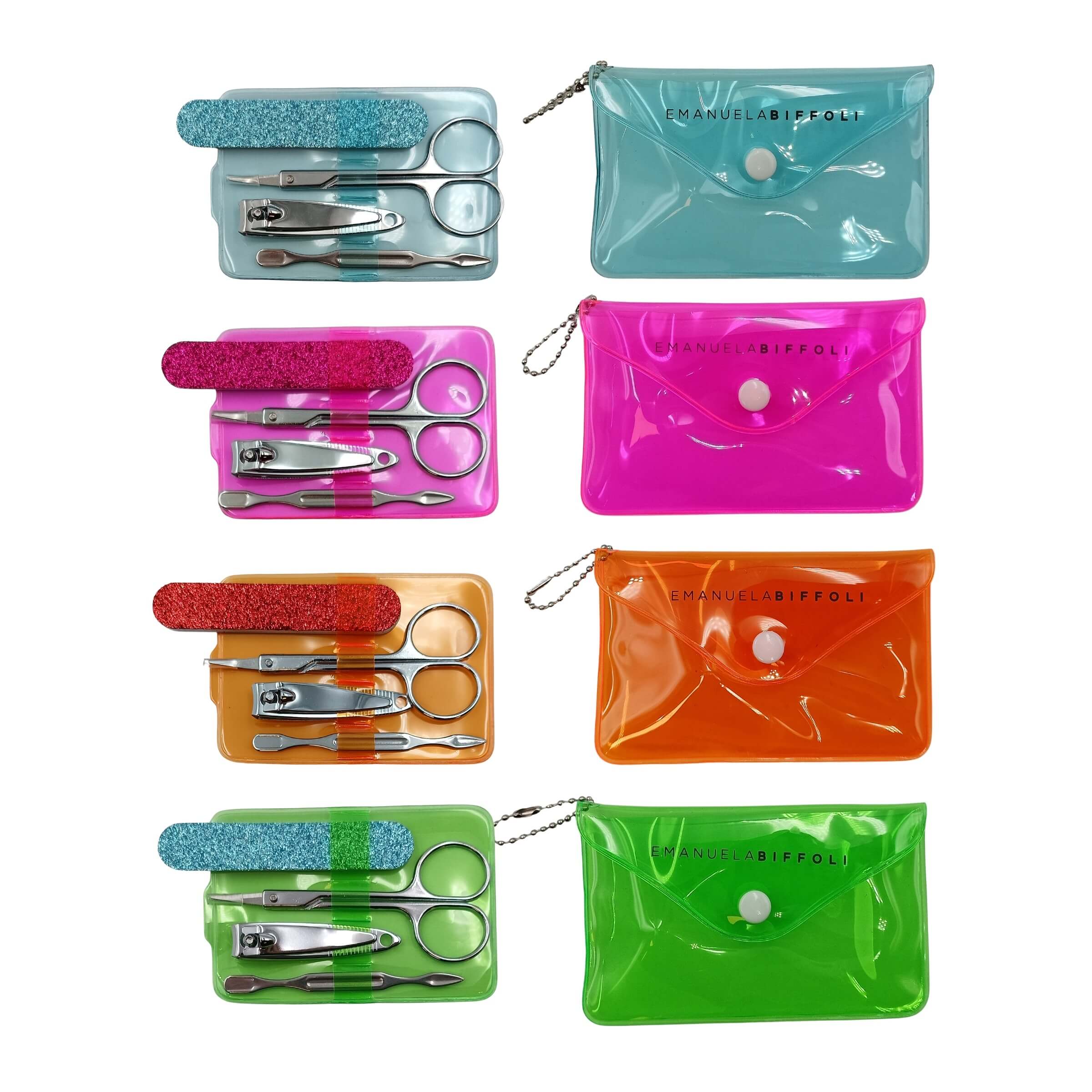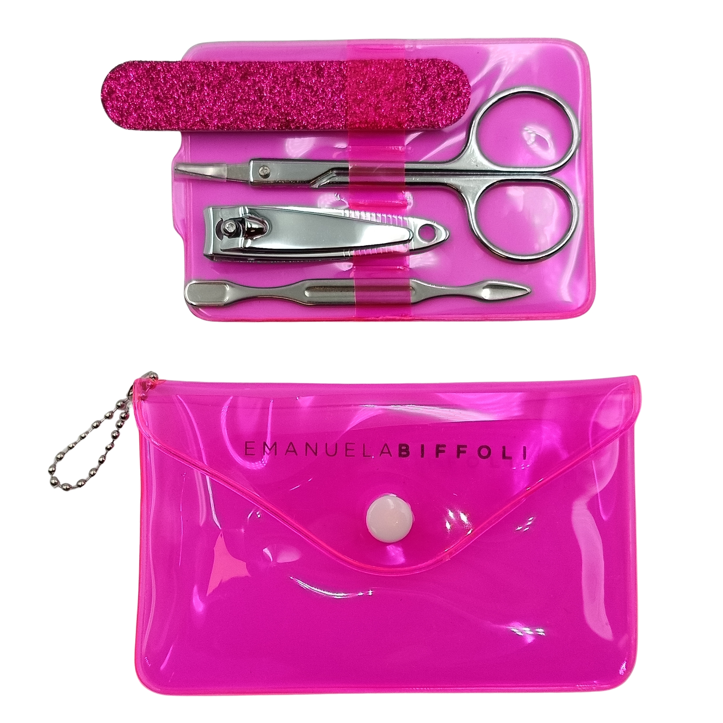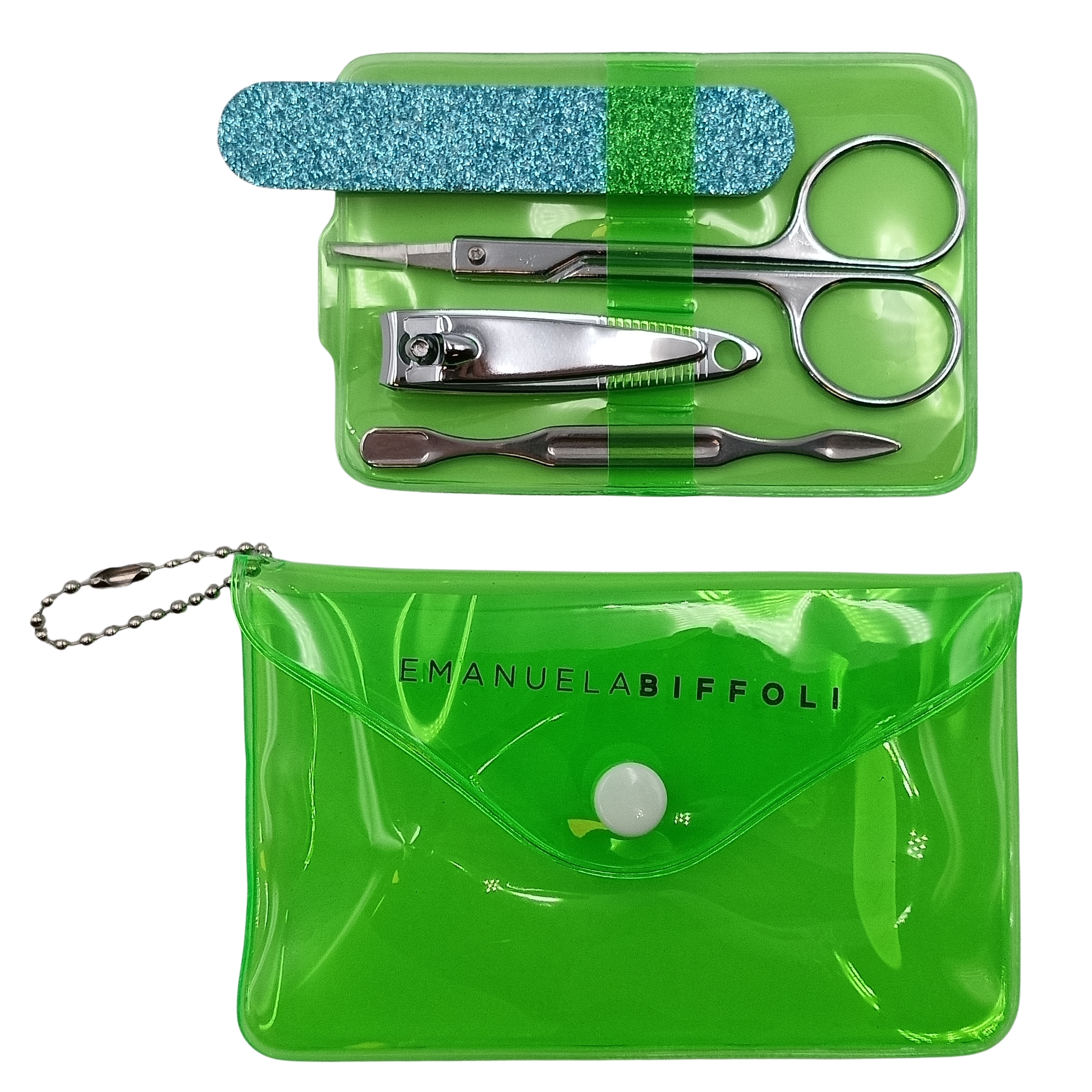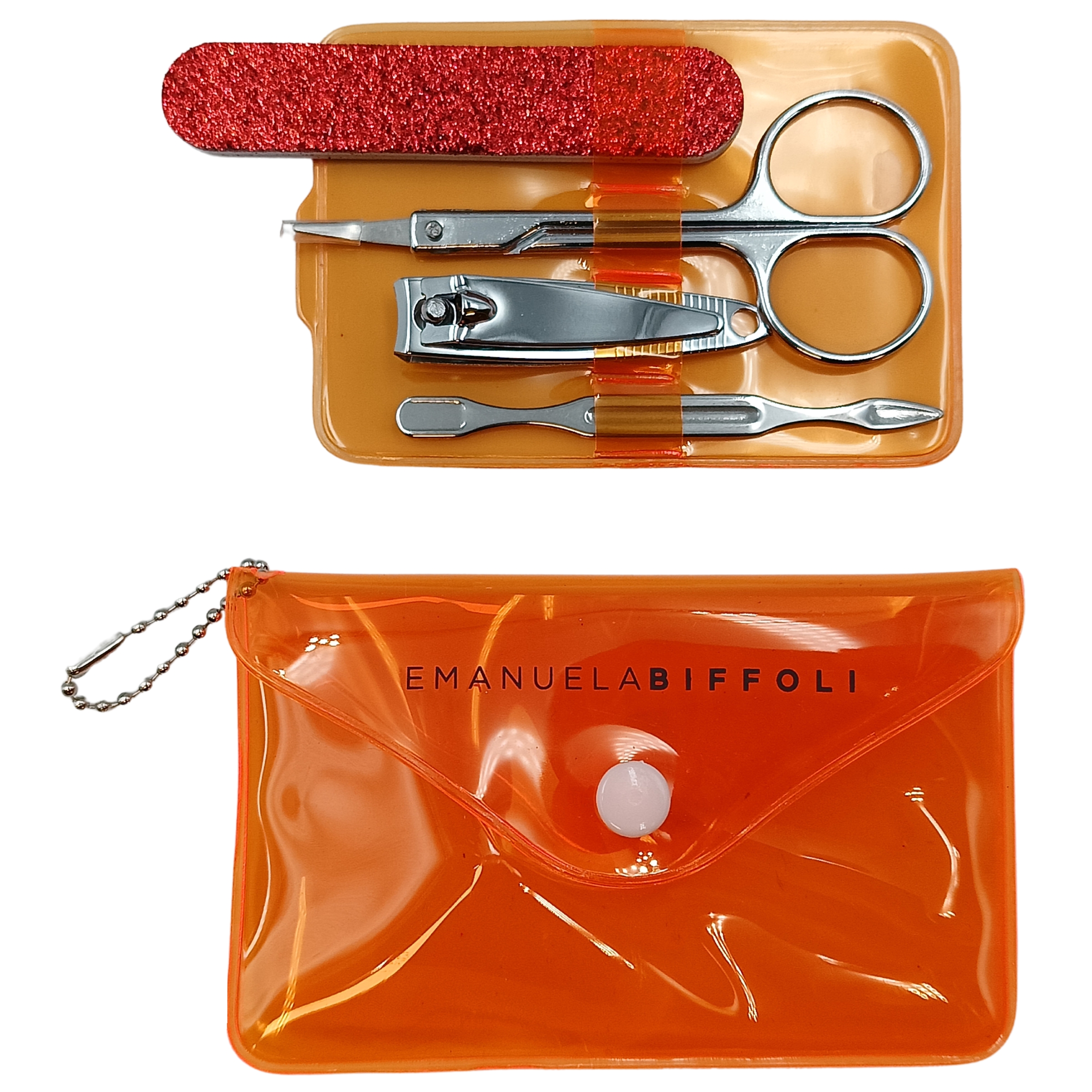 Il Set Manicure Emanuela Biffoli è un compagno di viaggio ideale per chi tiene alla cura delle proprie unghie anche fuori casa. Presentato in una pratica busta PVC, questo set è disponibile in quattro vivaci colori: Rosa, Arancione, Verde e Azzurro. Ogni set comprende quattro accessori essenziali per una manicure perfetta, garantendo praticità e qualità.• Tagliaunghie Mani da 5.5 cm: Preciso e robusto, questo strumento è ideale per un taglio netto e definito, essenziale per mantenere le unghie delle mani in perfetto ordine ovunque tu sia.• Lima in Cartone Doppia Grana da 8 cm: Con un lato fine e un lato grosso, questa lima permette di modellare le unghie con precisione, adattandosi a ogni necessità di forma e finitura.• Forbice per Pelli da 9 cm: Progettata per rimuovere con cura e precisione le cuticole e le pelli in eccesso, questa forbice è un must-have per mantenere un aspetto curato delle unghie.• Spingipelle con 2 Punte da 7.5 cm: Lo strumento perfetto per trattare le cuticole, consentendo di spingerle indietro delicatamente e di pulire l'area dell'unghia per una manicure professionale.Il Set Manicure Emanuela Biffoli è la soluzione ideale per chi desidera avere sempre a portata di mano tutto il necessario per una manicure d'emergenza o per un ritocco veloce, senza rinunciare alla qualità degli strumenti. Che tu sia in viaggio, al lavoro, o semplicemente fuori per una serata, questo set ti permette di prenderti cura delle tue unghie con stile e efficienza.Confezionato in una busta PVC trasparente, è facile da trasportare e da conservare, rendendolo un accessorio pratico e igienico, perfetto per essere inserito in borsa, in valigia o tenuto nel cassetto dell'ufficio. Scegli il tuo colore preferito e rendi la cura delle unghie un momento di puro piacere, anche quando sei lontano da casa.
