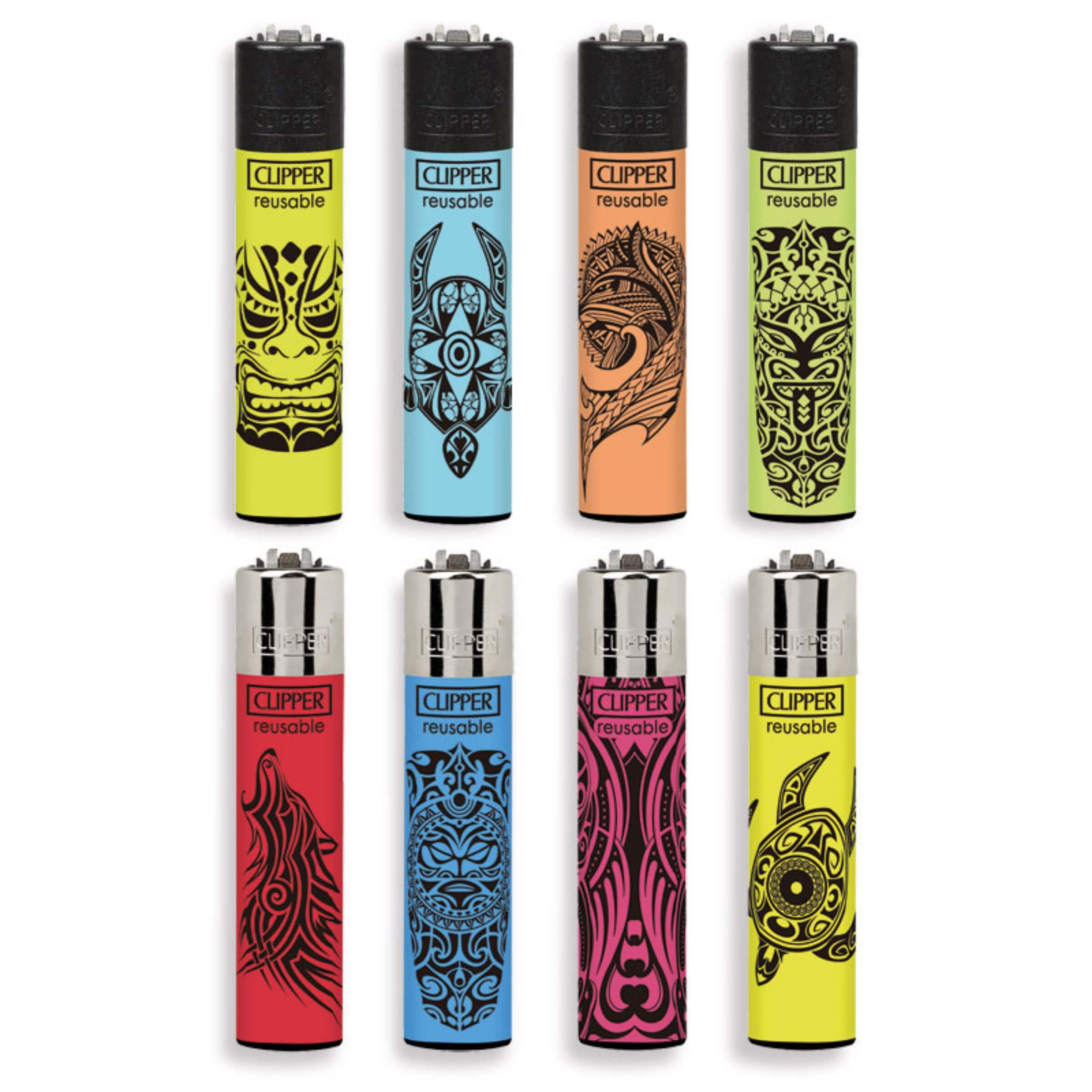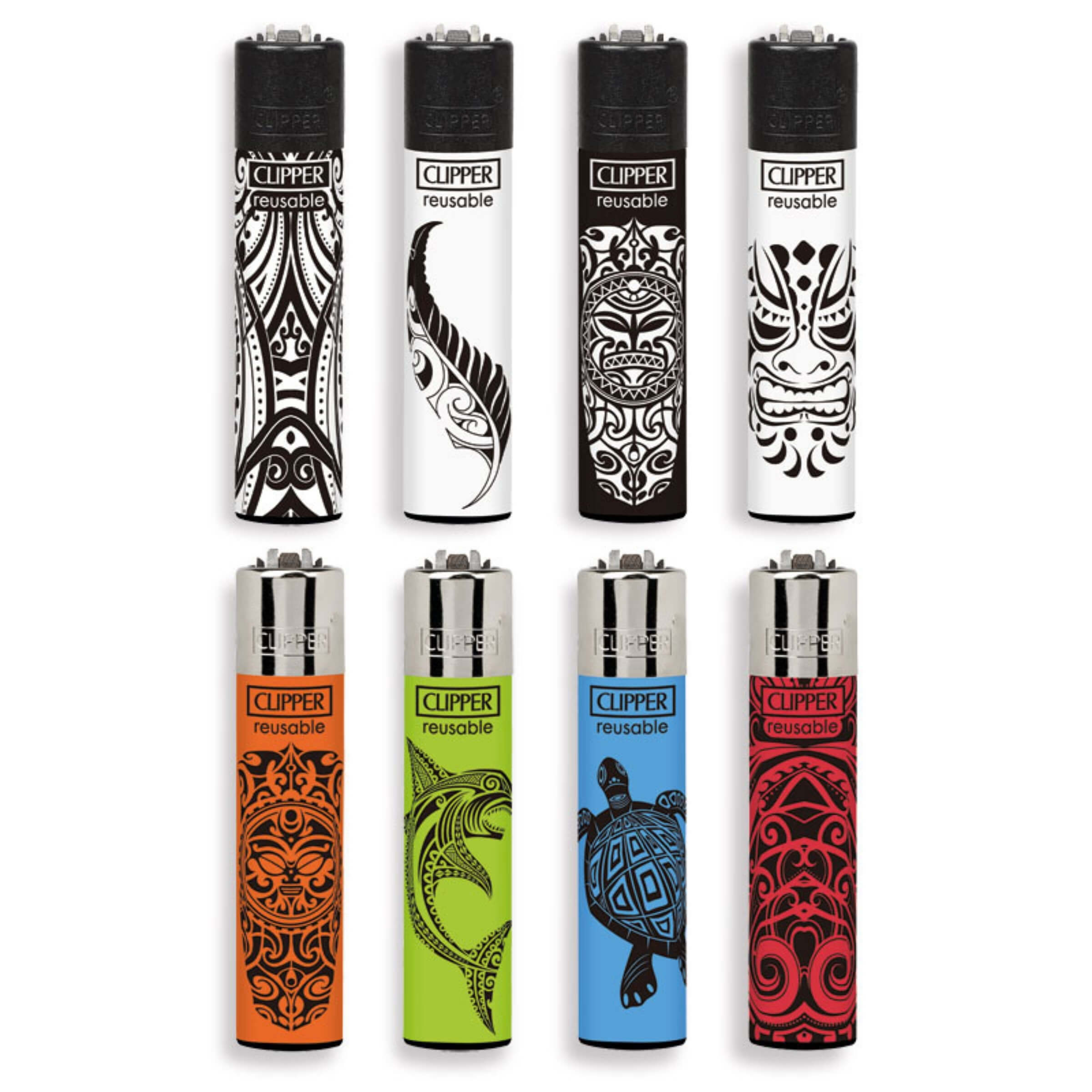 L’universo visivo delle culture polinesiane prende forma nella collezione Clipper Large Maori, una linea di accendini che unisce funzionalità e significato simbolico in ogni dettaglio. L’intero assortimento si ispira alla ricca tradizione delle incisioni maori, reinterpretate in chiave contemporanea attraverso una stampa diretta ad alta precisione. I motivi decorativi spaziano da maschere cerimoniali a tartarughe, delfini e forme astratte, tutti contraddistinti da linee fluide e simmetriche che evocano protezione, forza e connessione con gli elementi naturali. Ogni accendino è realizzato nel formato Clipper Large, con un’altezza di circa 7.5 centimetri, offrendo una presa comoda e una capacità di gas superiore rispetto agli accendini standard. La finitura opaca e le cromie accese valorizzano ulteriormente le grafiche tribali, rendendo ogni pezzo unico e immediatamente riconoscibile.