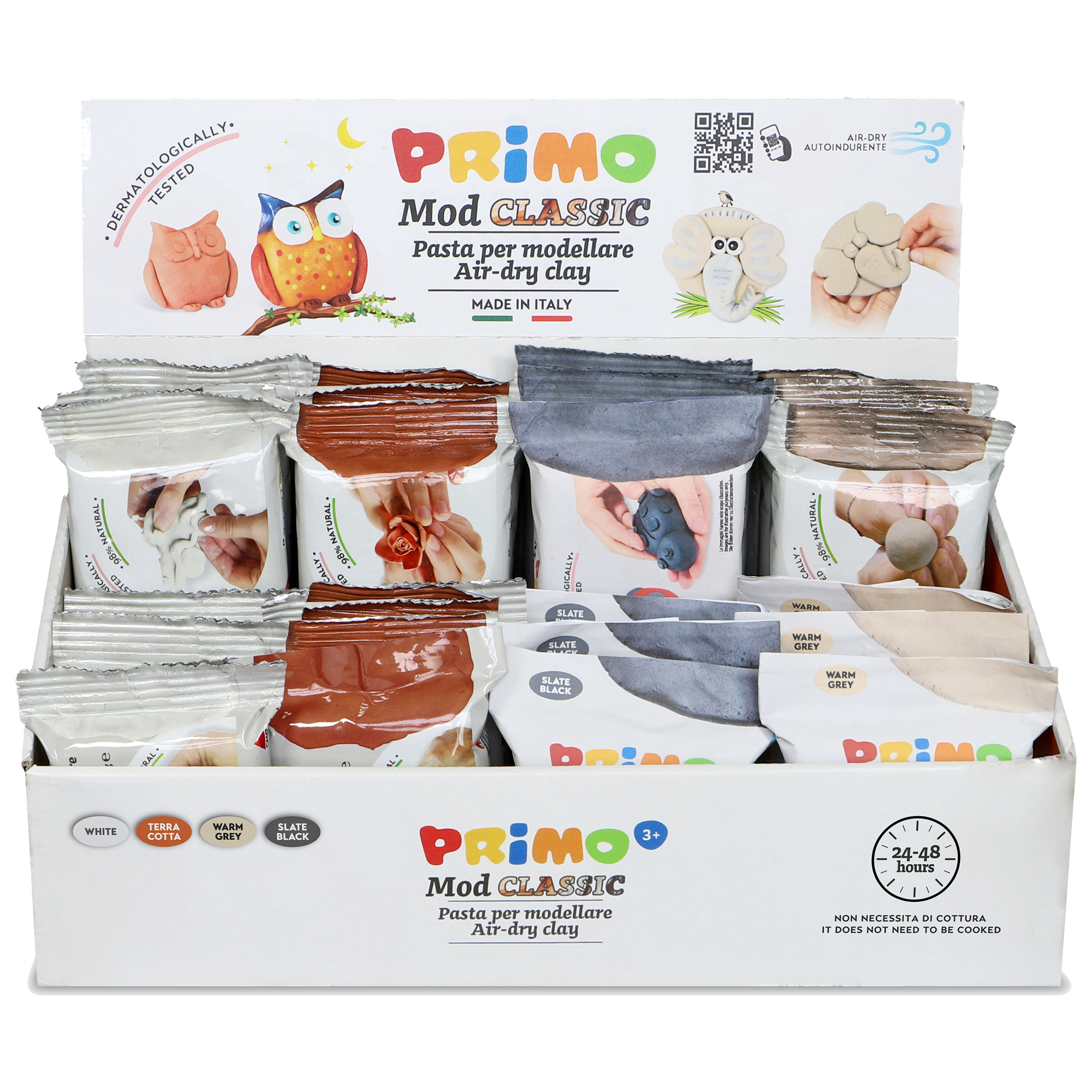 Expo da banco con 24 panetti da 250 g pasta modellabile. Colori assortiti classic.Pronta all'uso, asciuga all'aria senza bisogno di cottura. Una volta asciutta, puO' essere dipinta e verniciata.