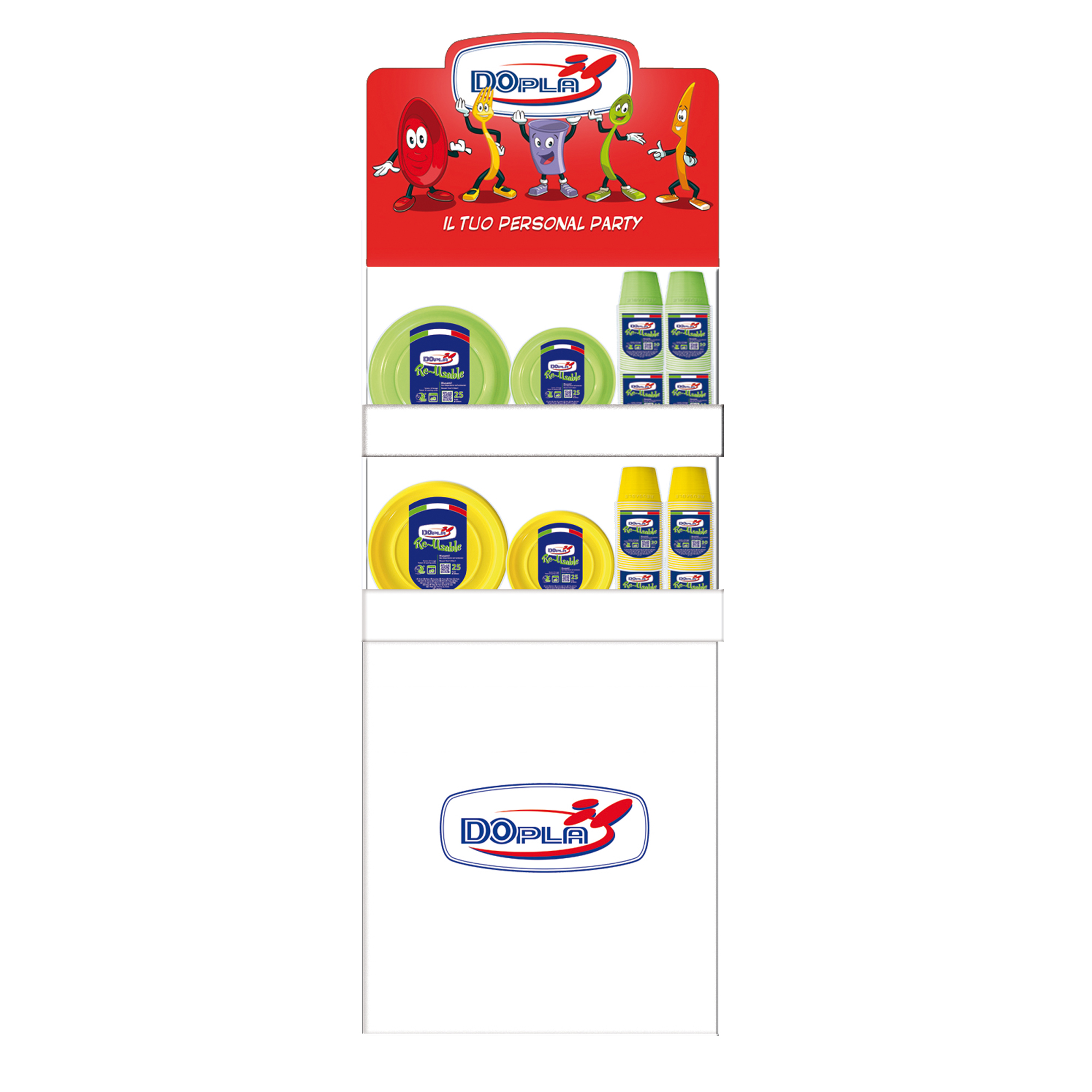 Espositore da terra Mini con piatti e bicchieri Reuse giallo e verde Dopla