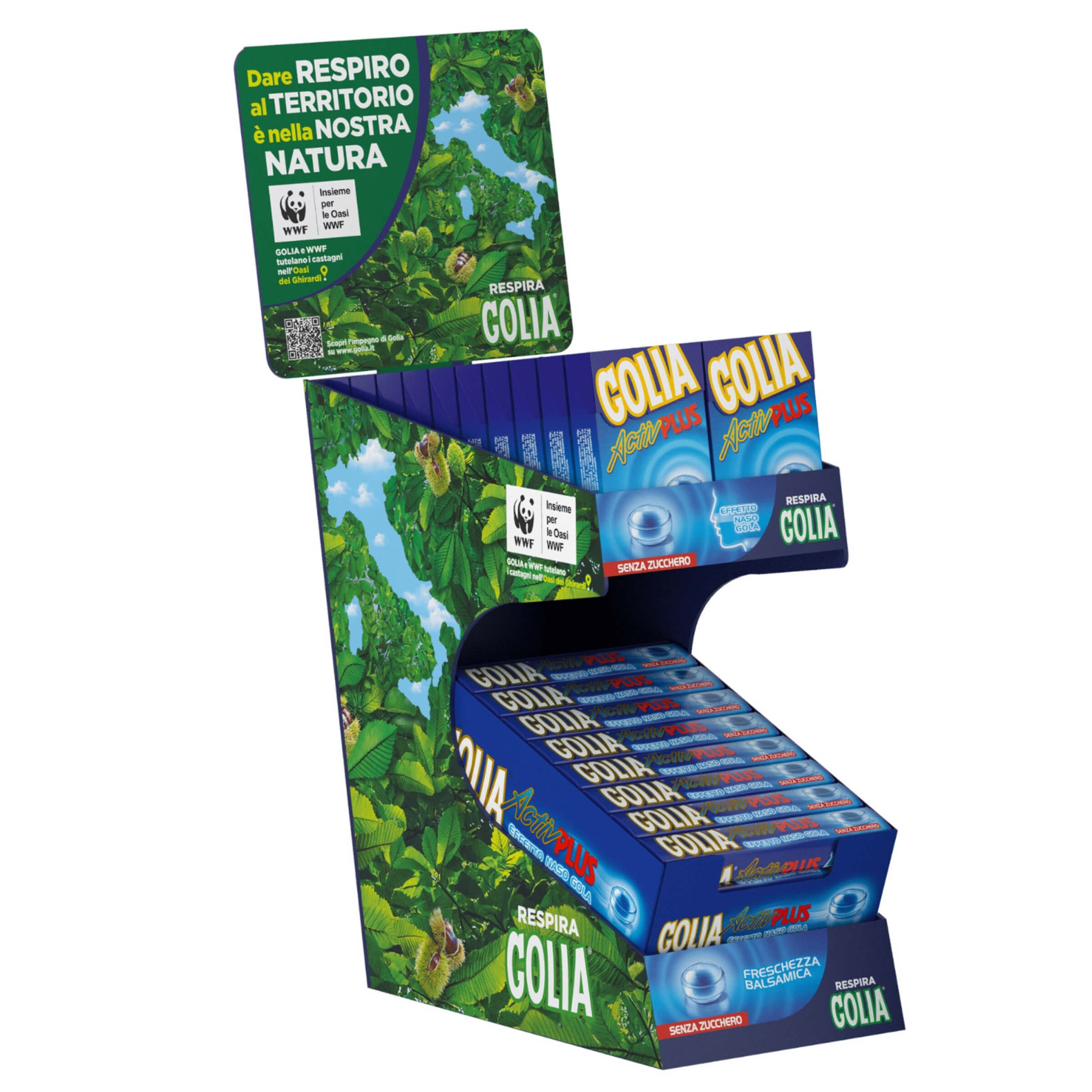Golia Activ Plus è molto più di una semplice caramella: è una vera e propria esperienza di freschezza che avvolge i sensi, progettata per offrire sollievo immediato e una piacevole sensazione balsamica. Questo espositore da banco, dal forte impatto visivo, combina due diversi formati per soddisfare esigenze di consumo differenti, offrendo una soluzione completa e funzionale per ambienti commerciali, tabaccherie, bar o aree d’attesa. La collaborazione tra Golia e WWF rafforza inoltre l'identità di un prodotto che si inserisce in un contesto di consapevolezza ambientale e responsabilità.• Composizione espositore: Il kit contiene 1 confezione da 20 astucci Golia Activ Plus classici e 1 confezione da 24 stick Golia Activ Plus formato Sticl, per un totale di 44 pezzi pronti alla vendita.• Doppio formato incluso: L’espositore combina la praticità degli astucci rigidi con la versatilità dei formati stick, offrendo al consumatore diverse opzioni di utilizzo in base al momento della giornata.• Freschezza intensa: Le caramelle Golia Activ Plus sono note per la loro formula balsamica senza zucchero, pensata per liberare il respiro e offrire un’immediata sensazione di freschezza duratura.• Senza zucchero: Tutti i prodotti contenuti nell’espositore sono privi di zucchero, ideali per chi cerca un sollievo rinfrescante senza compromettere l’equilibrio nutrizionale.• Comunicazione green: Il design dell’espositore evidenzia la collaborazione con WWF e l’impegno del brand per la tutela delle foreste italiane, rendendolo perfetto anche per attività attente alla sostenibilità.L’espositore Golia Activ Plus è pensato per accompagnare il respiro quotidiano con una proposta balsamica completa, fresca e consapevole. Una soluzione che integra gusto, funzionalità e responsabilità in un unico formato pratico e pronto per la vendita.