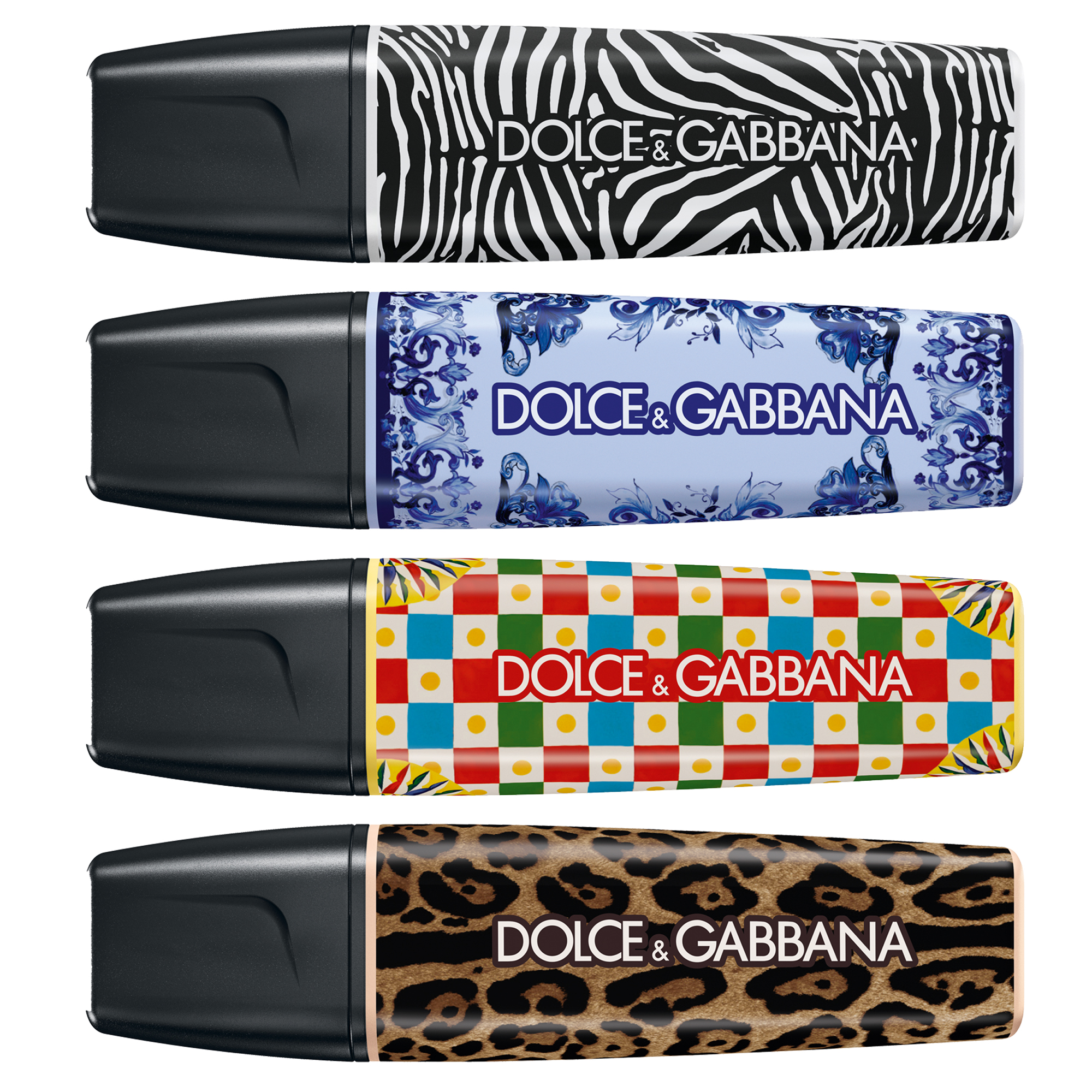 ESPOSITORE DA BANCO CON 6 ESCLUSIVI COFANETTI DOTATI DI CHIUSURA MAGNETICA E DECORATI CON I FREGI TIPICI DEL CARRETTO SICILIANO. OGNI COFANETTO CONTIENE 4 EVIDENZIATORI DAL DESIGN SENZA TEMPO, ISPIRATI ALL'INCONFONDIBILE STILE DOLCEEGABBANA. STABILO BOSS NERO CON DISEGN ZEBRA, AZZURRO GHIACCIO CON DESIGN BLU MEDITERRANEO, GIALLO BANANA CON DESIGN CARRETTO SICILIANO E COLOR SABBIA CON DESIGN LEO.