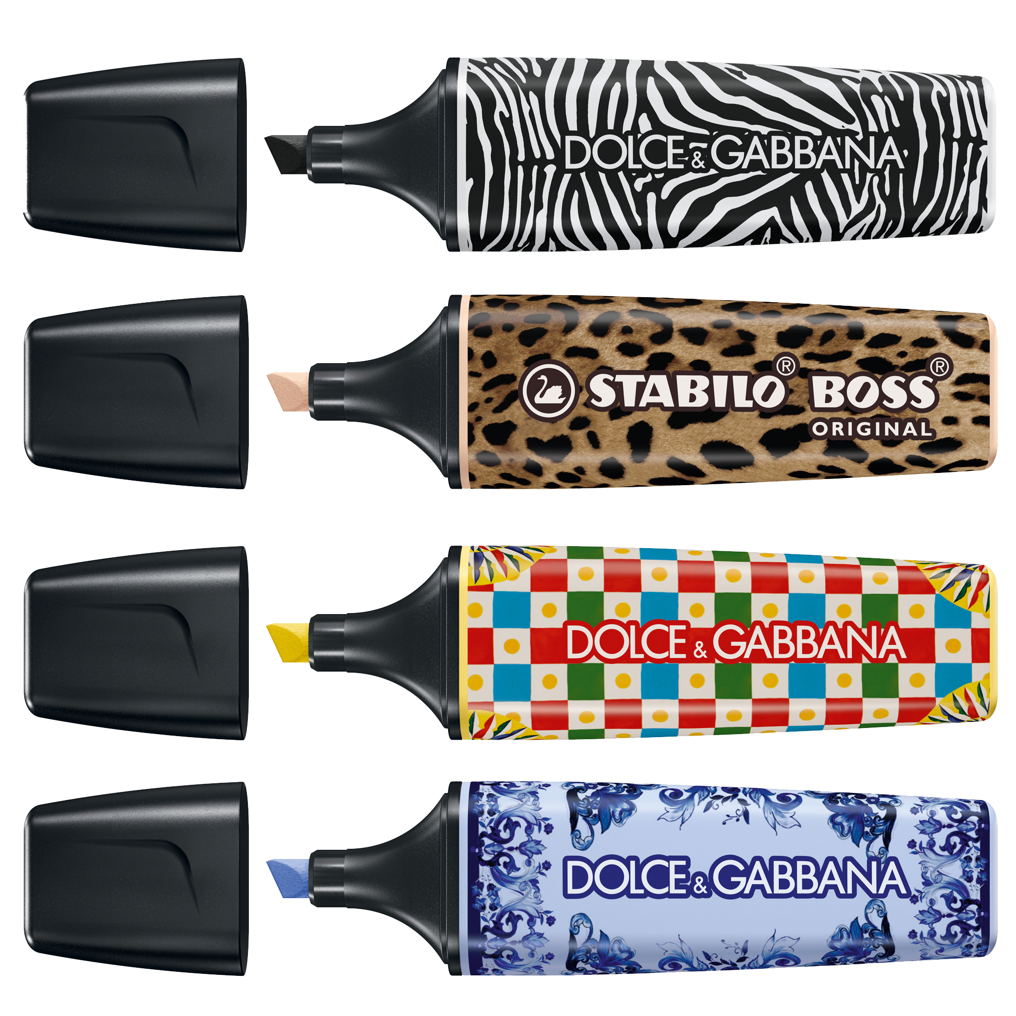 ESPOSITORE DA BANCO CON 6 ESCLUSIVI COFANETTI DOTATI DI CHIUSURA MAGNETICA E DECORATI CON I FREGI TIPICI DEL CARRETTO SICILIANO. OGNI COFANETTO CONTIENE 4 EVIDENZIATORI DAL DESIGN SENZA TEMPO, ISPIRATI ALL'INCONFONDIBILE STILE DOLCEEGABBANA. STABILO BOSS NERO CON DISEGN ZEBRA, AZZURRO GHIACCIO CON DESIGN BLU MEDITERRANEO, GIALLO BANANA CON DESIGN CARRETTO SICILIANO E COLOR SABBIA CON DESIGN LEO.