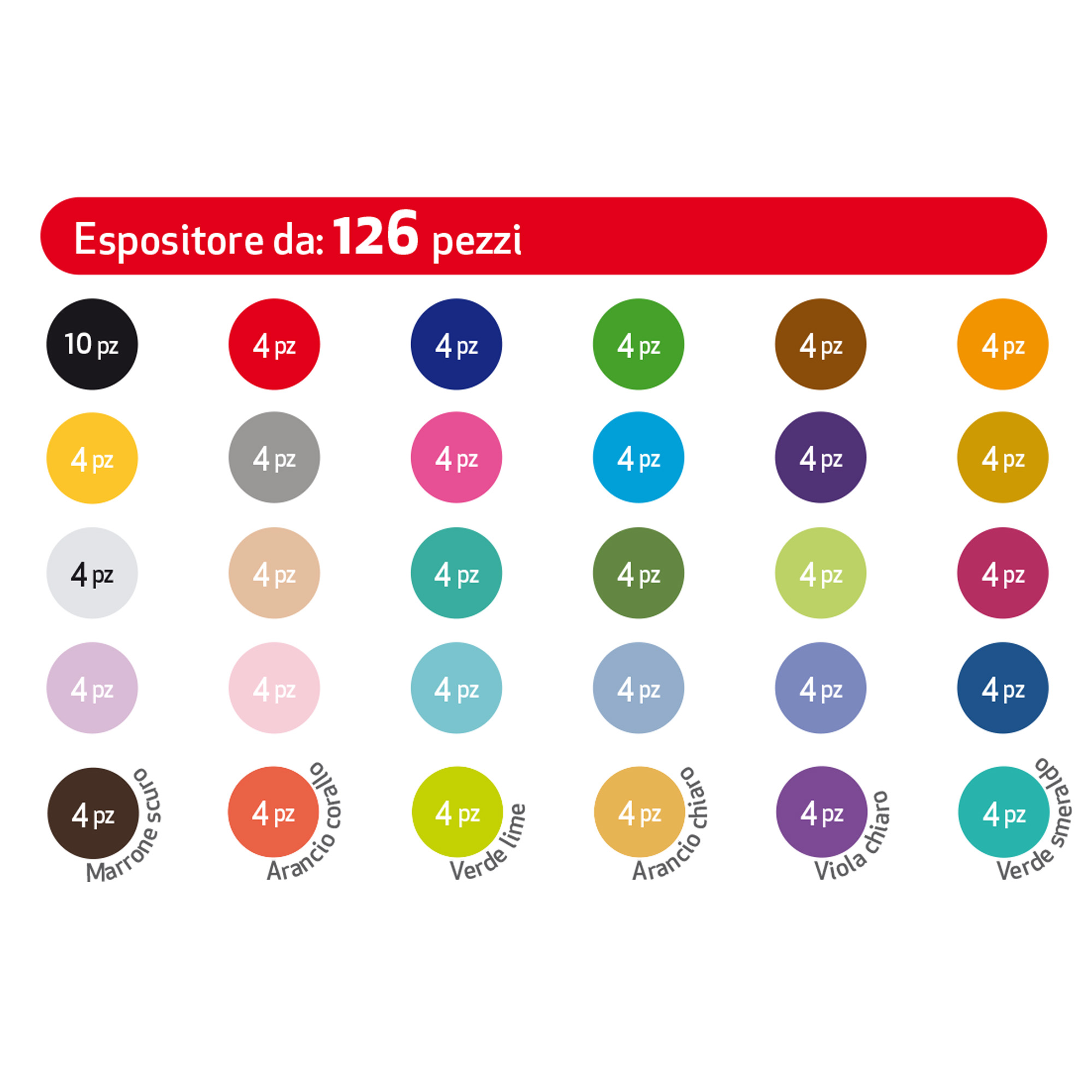 PENNARELLO CON PUNTA IN FIBRA A PENNELLO:10 PZ NERO, 4 PZ BLU, 4 PZ ROSSO, 4 PZ VERDE, 4 PZ AZZURRO, 4 PZ ROSA, 4 PZ VIOLA, 4 PZ GRIGIO, 4 PZ GIALLO, 4 PZ ARANCIO, 4 PZ MARRONE, 4 PZ OCRA, 4 PZ ROSSO CARMINIO, 4 PZ BLU ACCIAIO, 4 PZ VERDE OLIVA, 4 PZ TURCHESE, 4 PZ SABBIA, 4 PZ VERDE CHIARO, 4 PZ GRIGIO CHIARO, 4 PZ ROSA PEONIA, 4 PZ ROSA PASTELLO, 4 PZ BLU POLVERE, 4 PZ BLU REALE, 4 PZ INDACO, 4 PZ CORALLO, 4 PZ VERDE SMERALDO, 4 PZ MARRONE SCURO, 4 PZ ARANCIO CHIARO, 4 PZ VERDE LIME, 4 PZ VIOLA CHIARO.