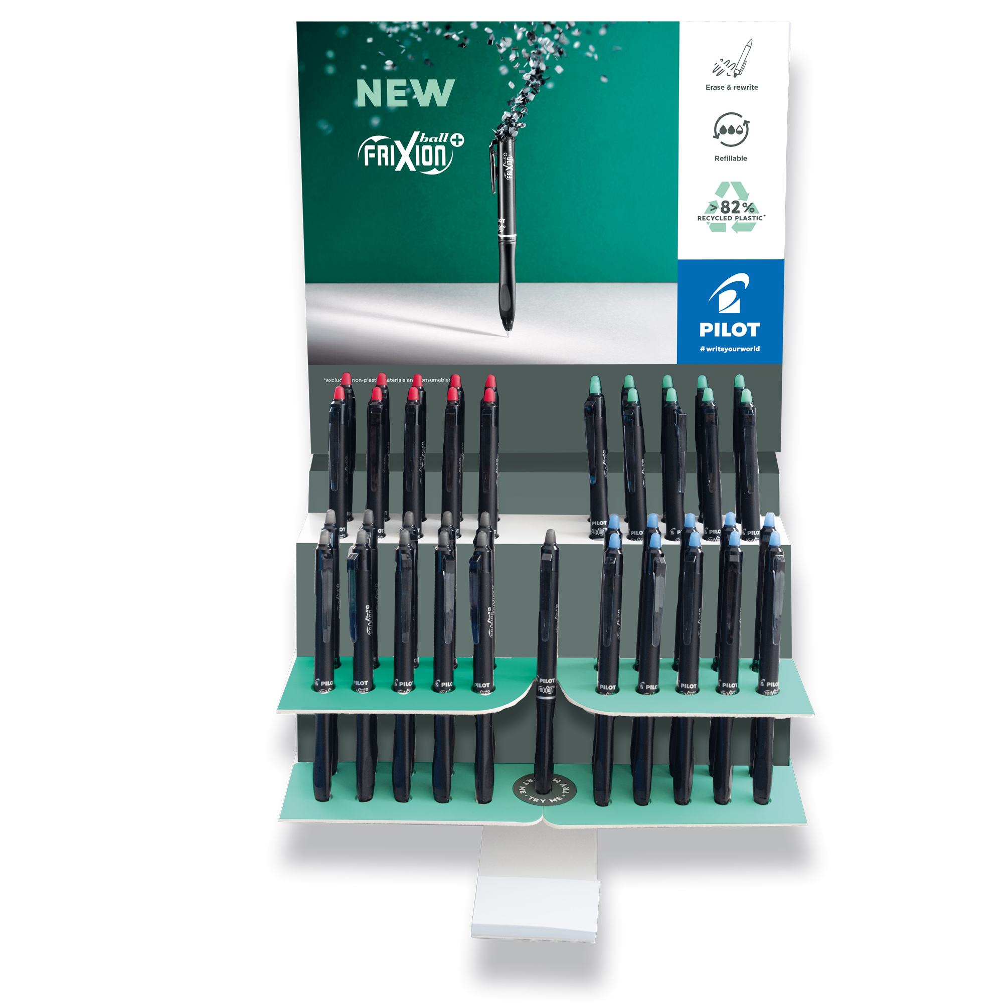 Espositore da banco con 40+1 Frixion Ball+. Penna realizzata con almeno l'82% di plastica riciclata (escluso i refill e componenti non plastici. Colori assortiti: nero, blu, rosso e verde.