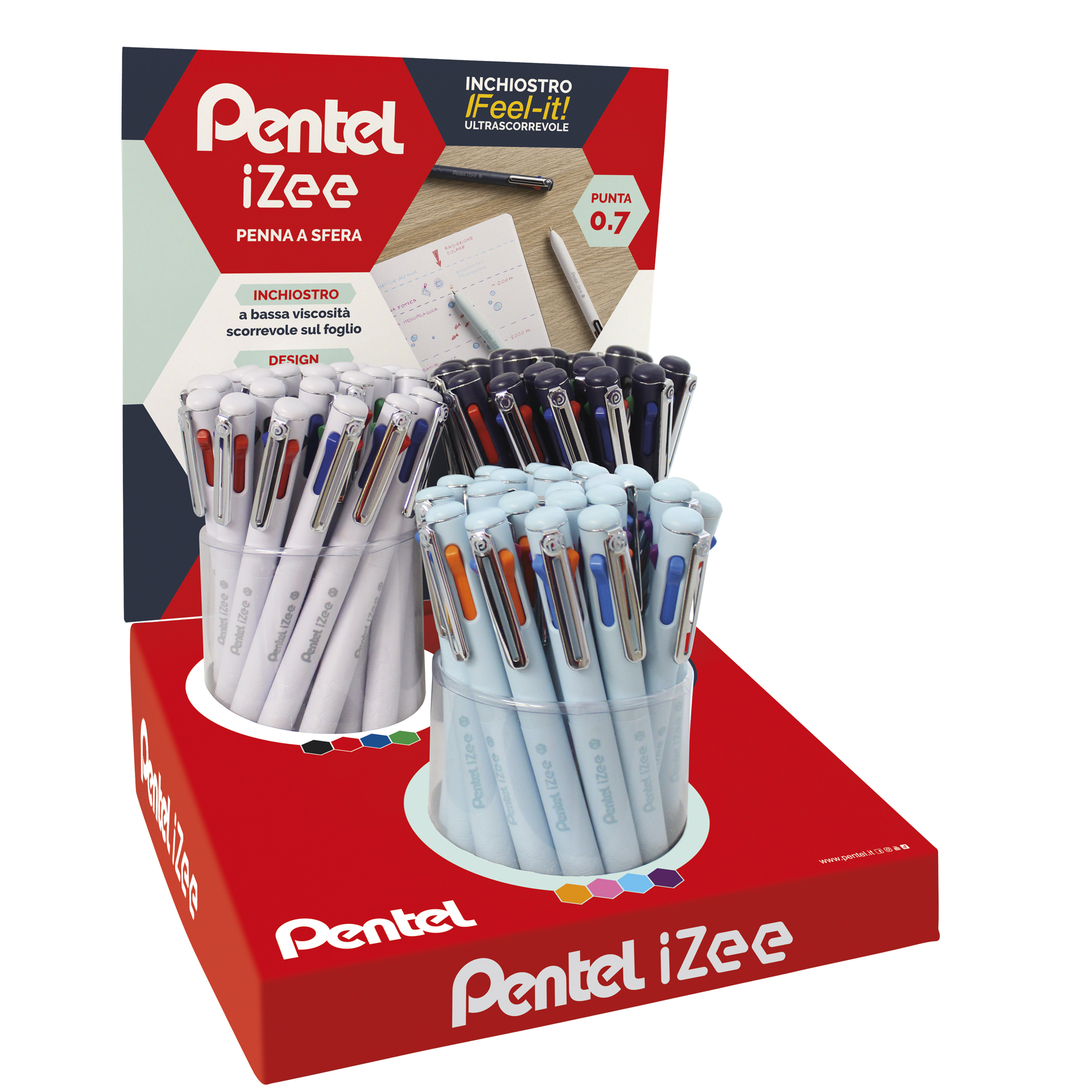 ESPOSITORE DA BANCO CON 36 PENNE A SFERA IZEE 4 COLORI. ASSORTIMENTO DI 3 VERSIONI DIFFERENTI.
